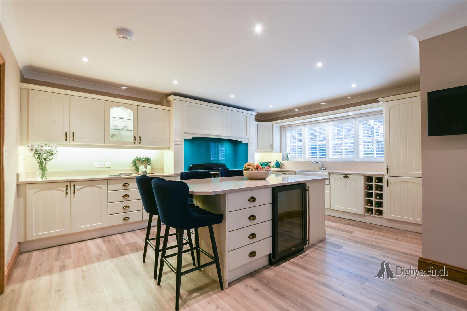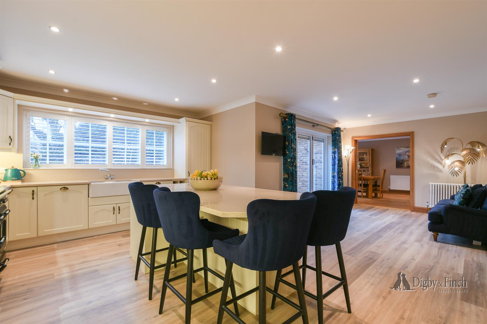 The well-appointed kitchen offers an extensive range of wall and floor standing cabinets, complemented by quartz work surfaces and a substantial central island with breakfast bar seating. Integrated appliances include a large range cooker, fridge freezer, dishwasher and wine fridge, along with a double Belfast sink, combining both practicality and understated style. This is a sociable space, ideal for casual dining or gathering with family and friends while meals are prepared.