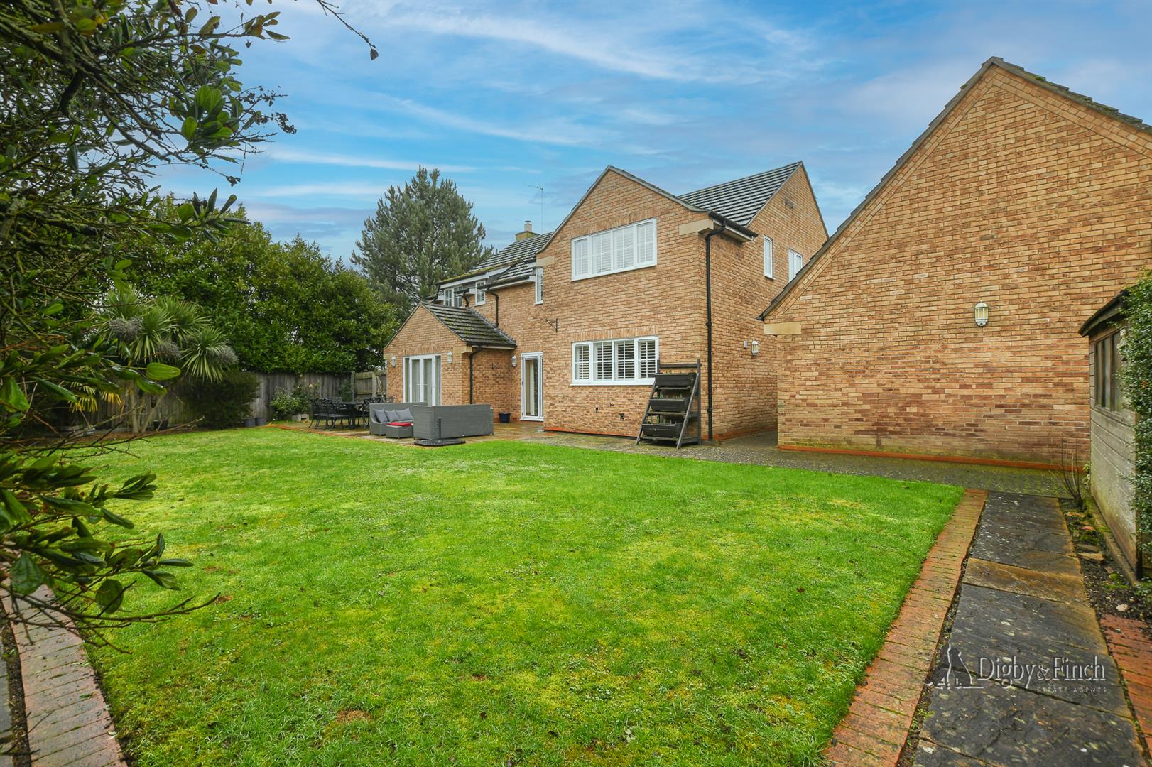 The enclosed west-facing rear garden is generous in size, predominantly laid to lawn and complemented by a paved terrace, providing an ideal setting for outdoor dining, entertaining and family enjoyment.