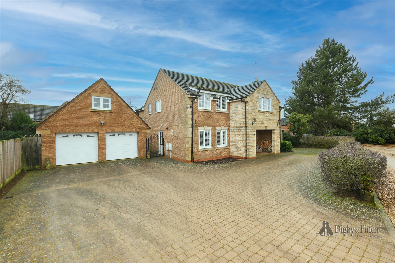 Outside, the property is approached via a substantial block-paved driveway that wraps around the house, providing extensive parking along with an area ideal for a camper van or caravan. A particularly appealing and versatile feature is the detached double garage, which incorporates a spacious room above. Currently used for storage, this space offers excellent potential as a home office, annexe or guest accommodation, subject to any necessary consents.