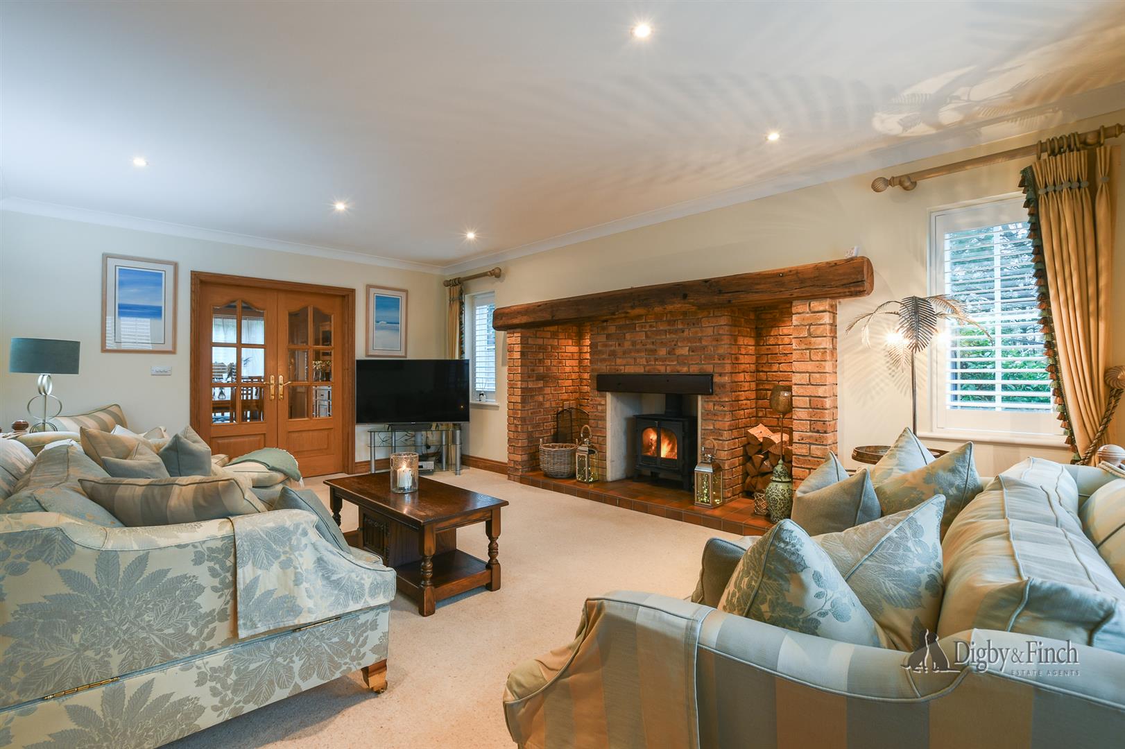 The sitting room is a particularly attractive space, centred around an inglenook fireplace housing a wood-burning stove, which forms a warm and welcoming focal point. Double doors connect through to the dining room, allowing an excellent flow for entertaining and larger gatherings, while further glazed double doors lead into the impressive open-plan kitchen and living space, the true heart of the home.