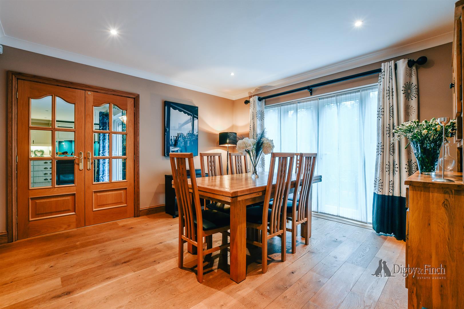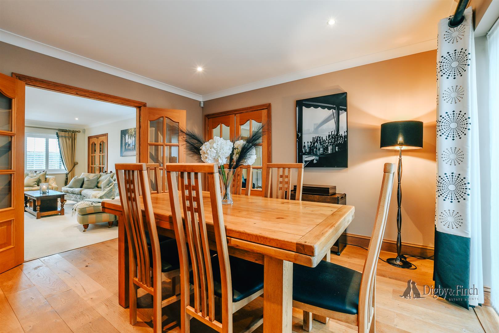 The ground floor is arranged around a striking reception hallway, where a handsome oak staircase creates an immediate sense of quality, complemented by oak flooring, doors and skirting throughout. From here, the accommodation flows naturally from one room to the next. There are three well-proportioned reception rooms comprising a generous sitting room, a formal dining room with French doors opening onto the rear garden, and a substantial study positioned away from the main hub of the home, providing a quiet and private space for working or studying.