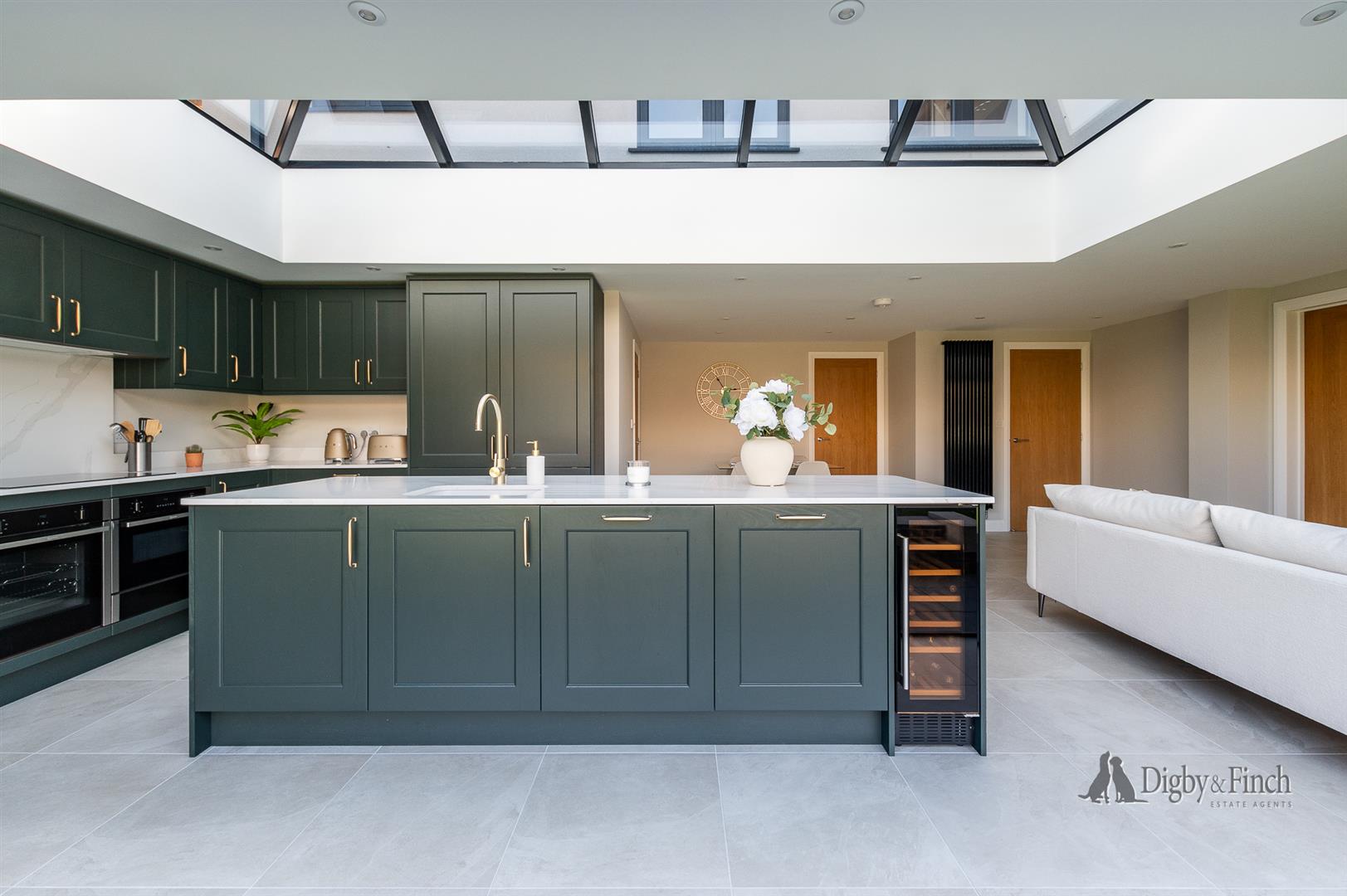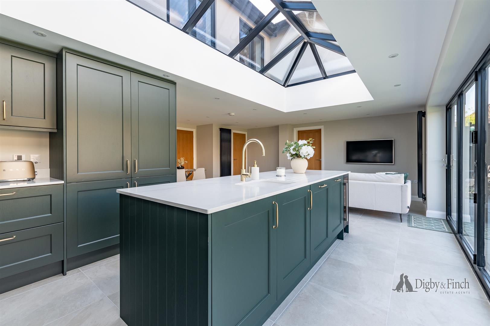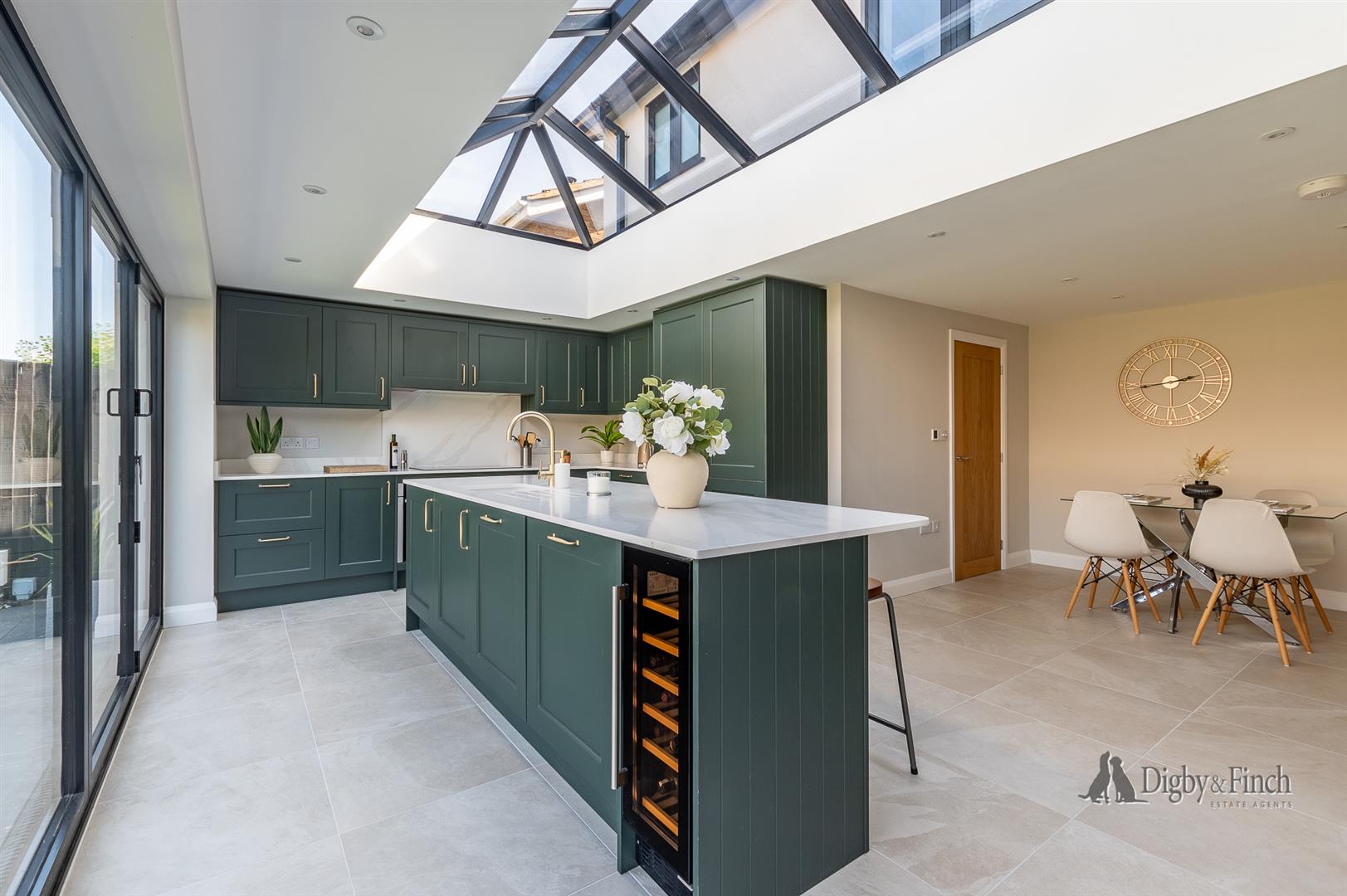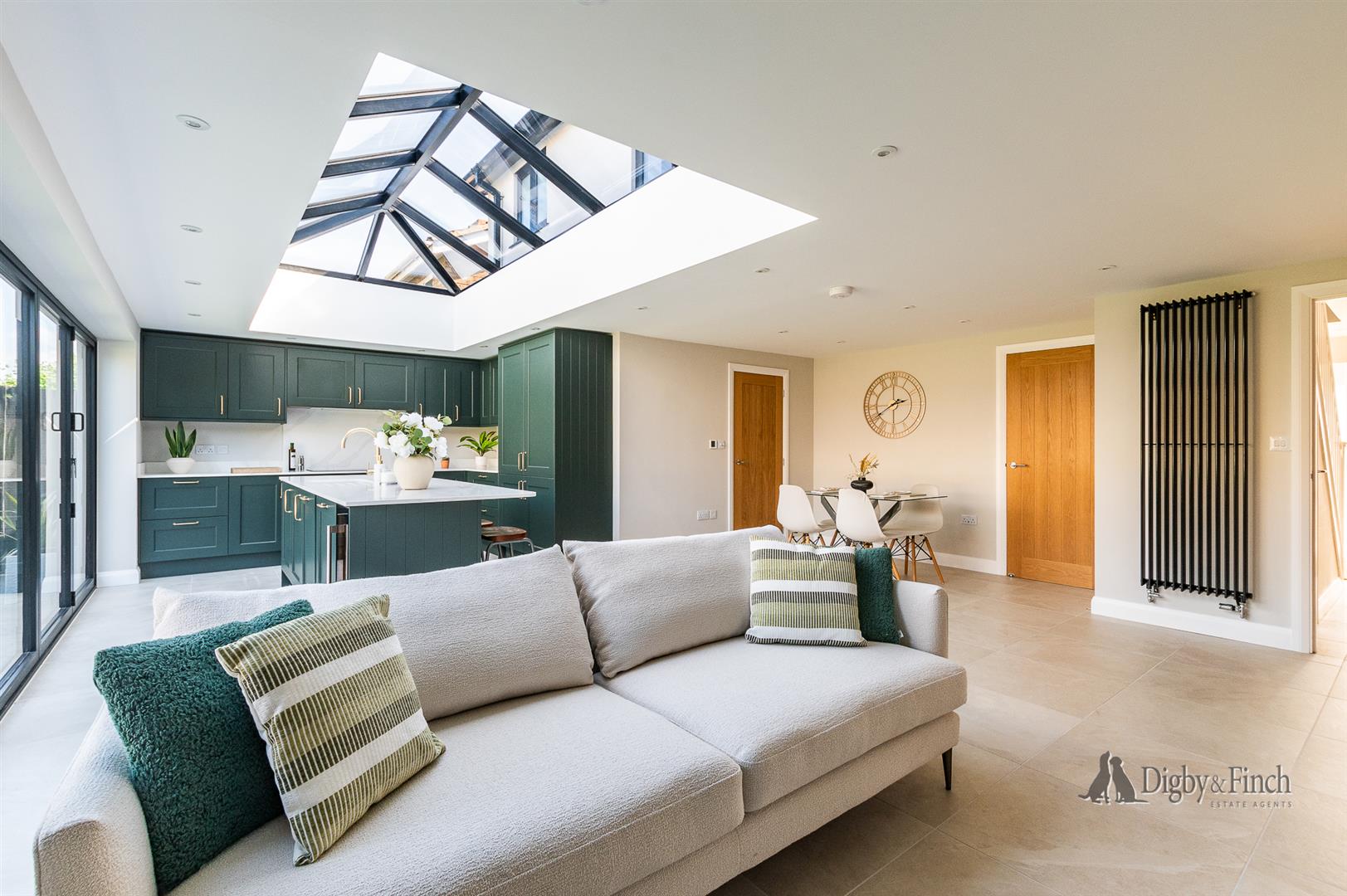 Underfloor heating runs throughout the kitchen dining living space and a large roof lantern complements the bifold doors giving a bright uplifting feel to this perfect kitchen living space.