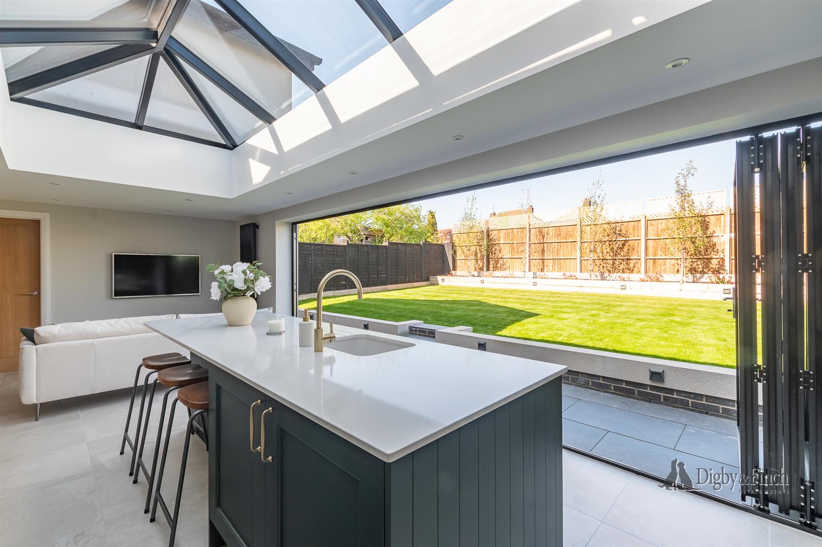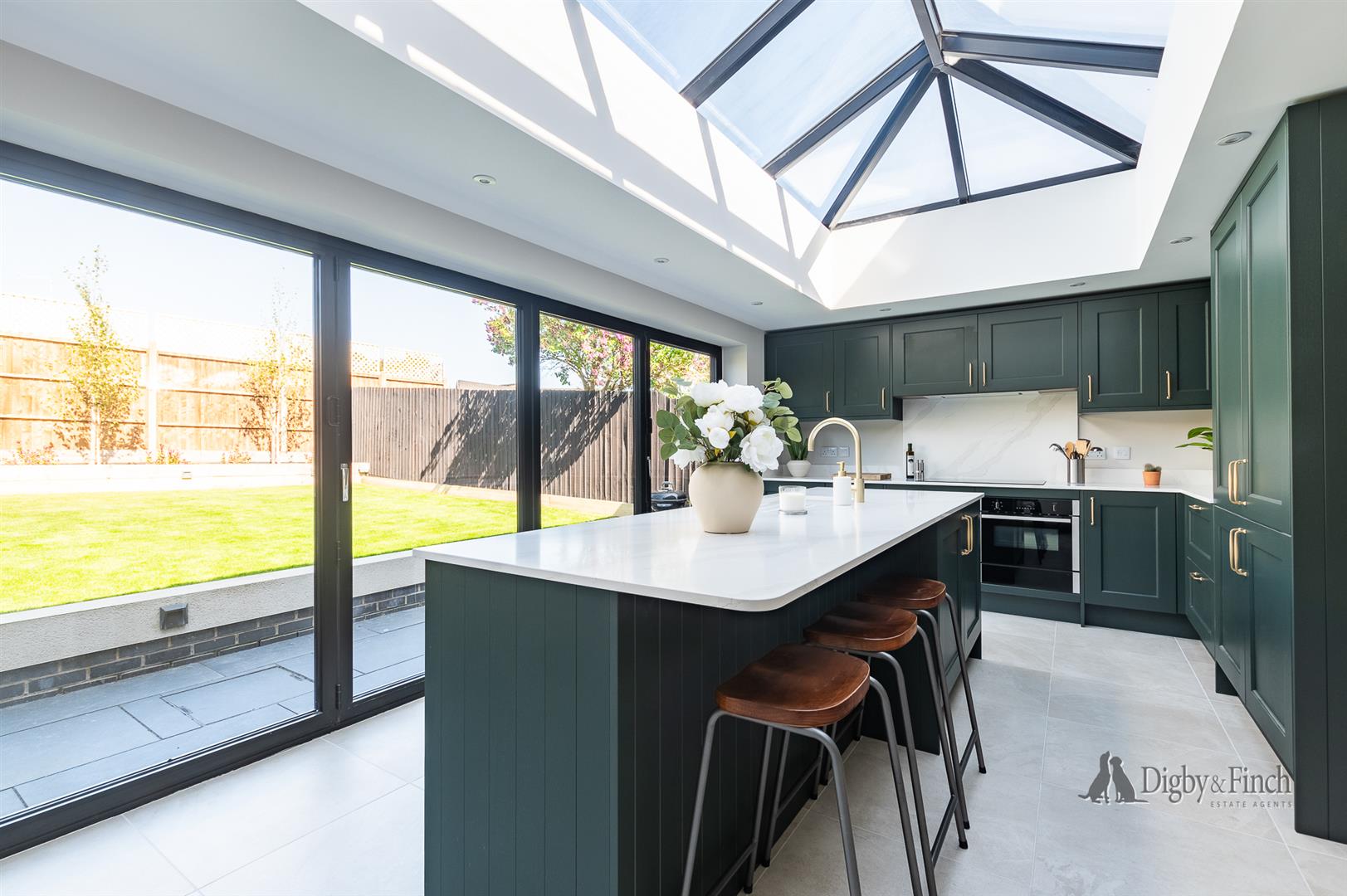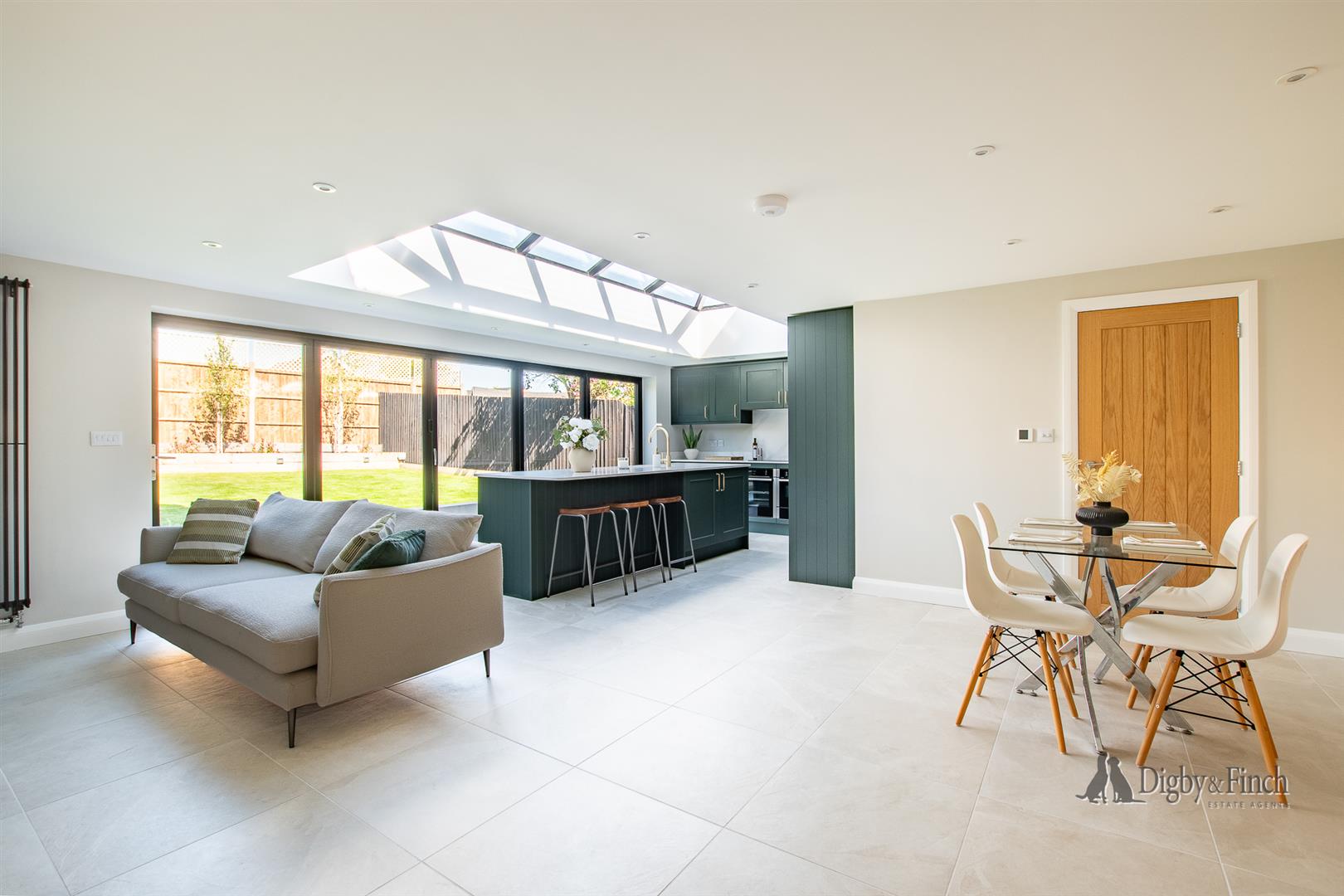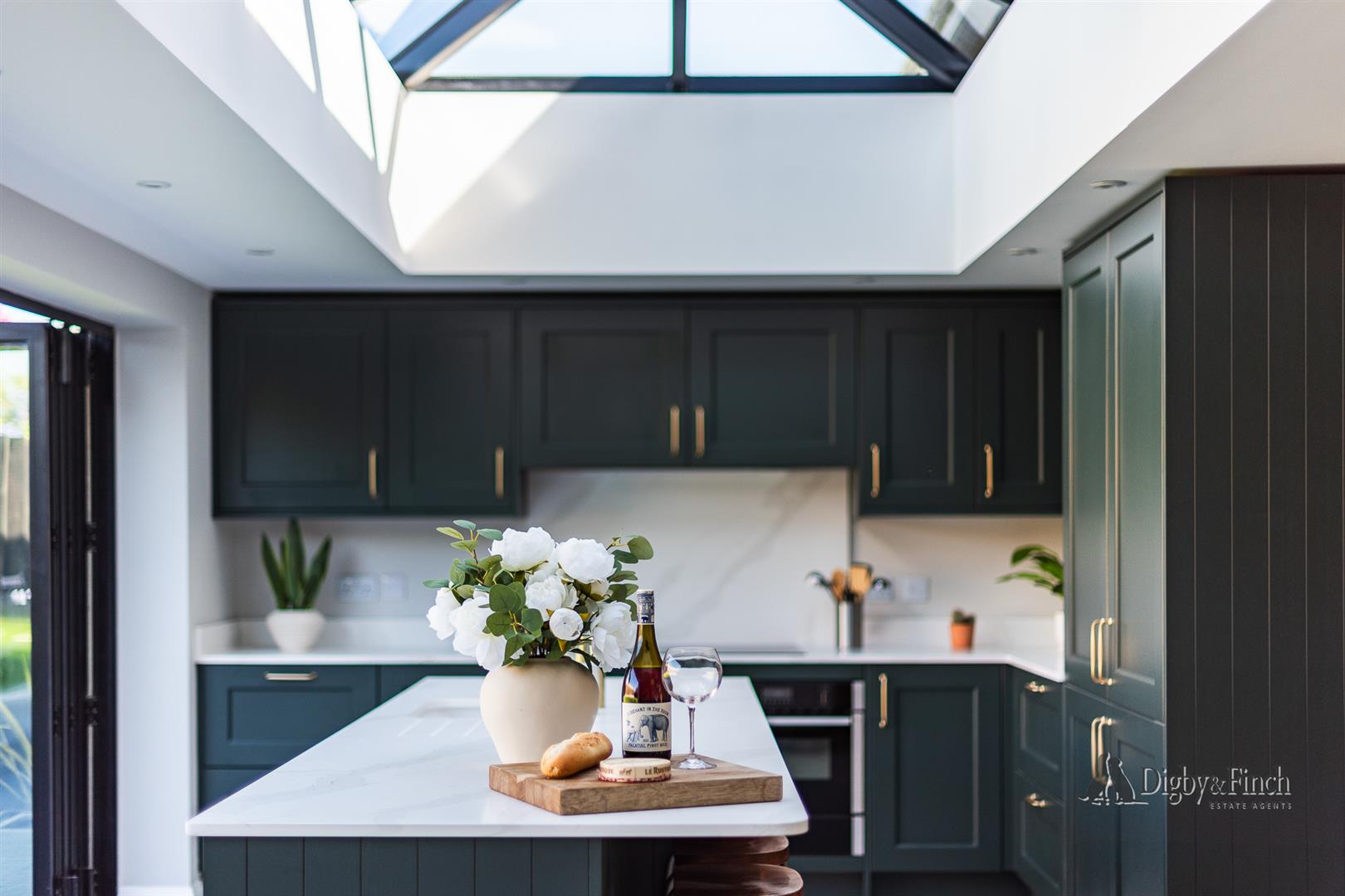 Underfloor heating runs throughout the kitchen dining living space and a large roof lantern complements the bifold doors giving a bright uplifting feel to this perfect kitchen living space.