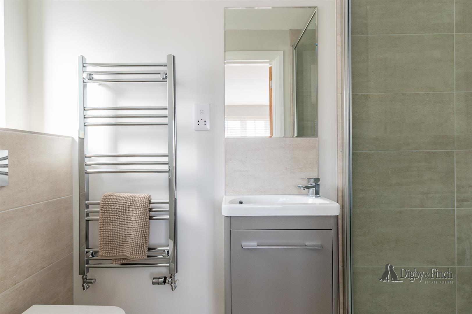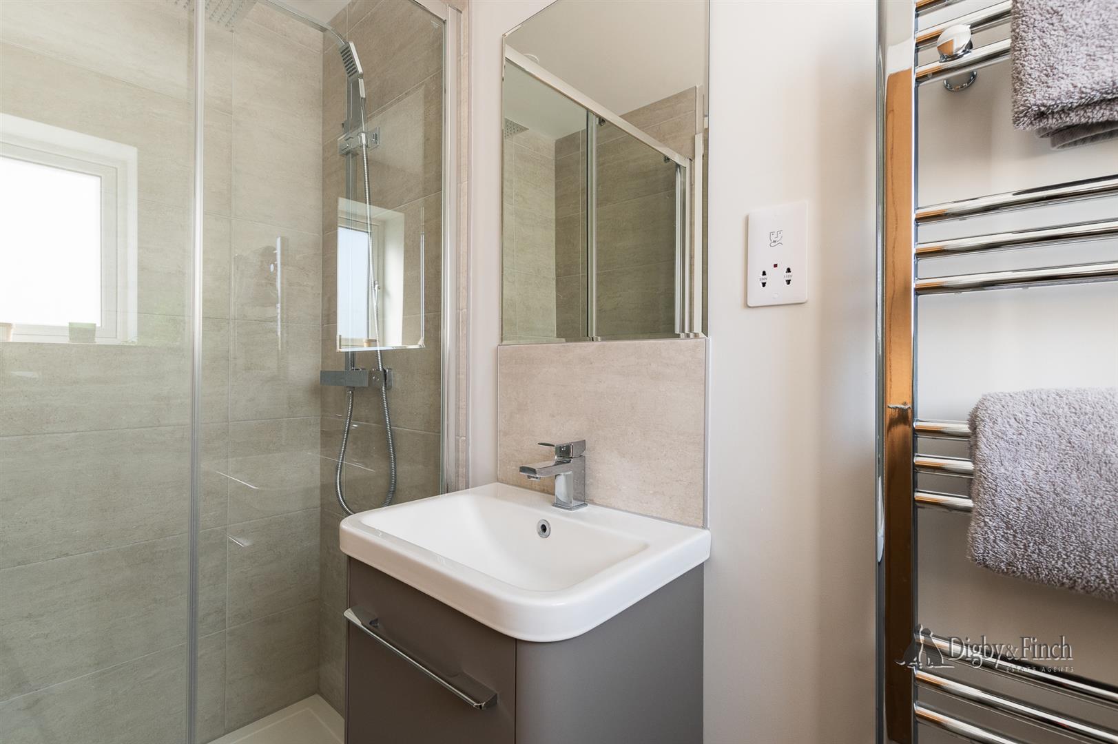 The principal bedroom has in built wardrobes offering hanging and shelving solutions plus an ensuite shower room which offers a large enclosure with rain head shower, a loo, towel radiator and a vanity wash basin with storage beneath.