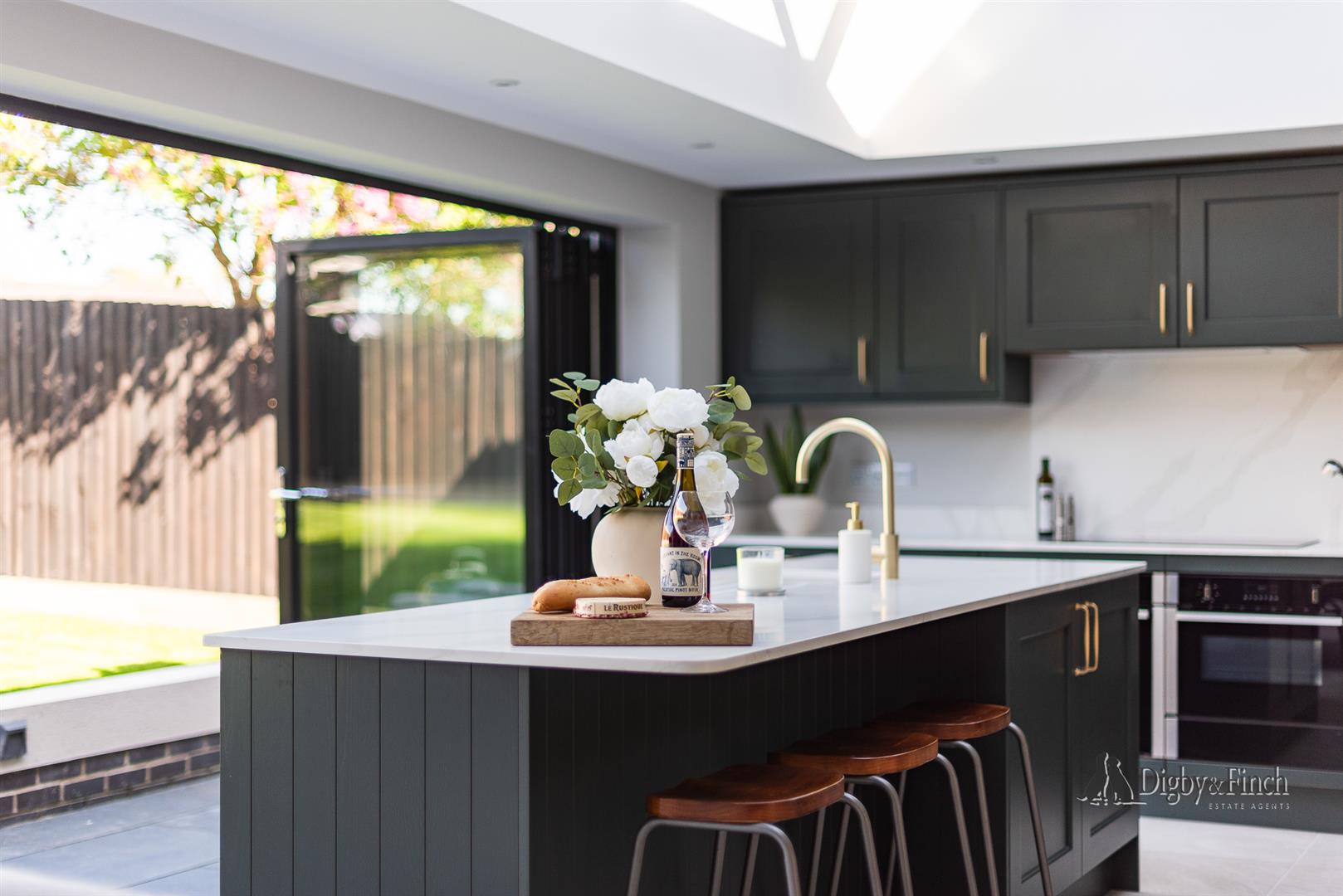 The stunning kitchen offers a range of very high quality wall and floor cabinets which are arranged around a large central island/breakfast bar.