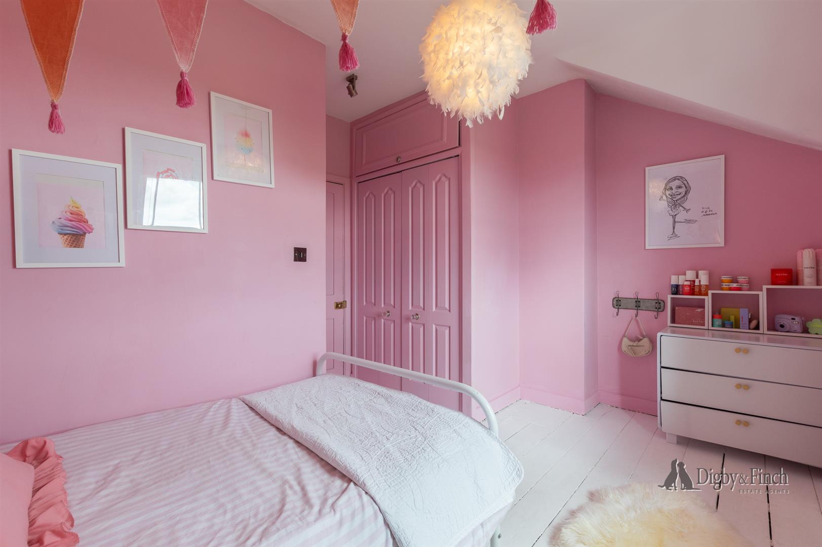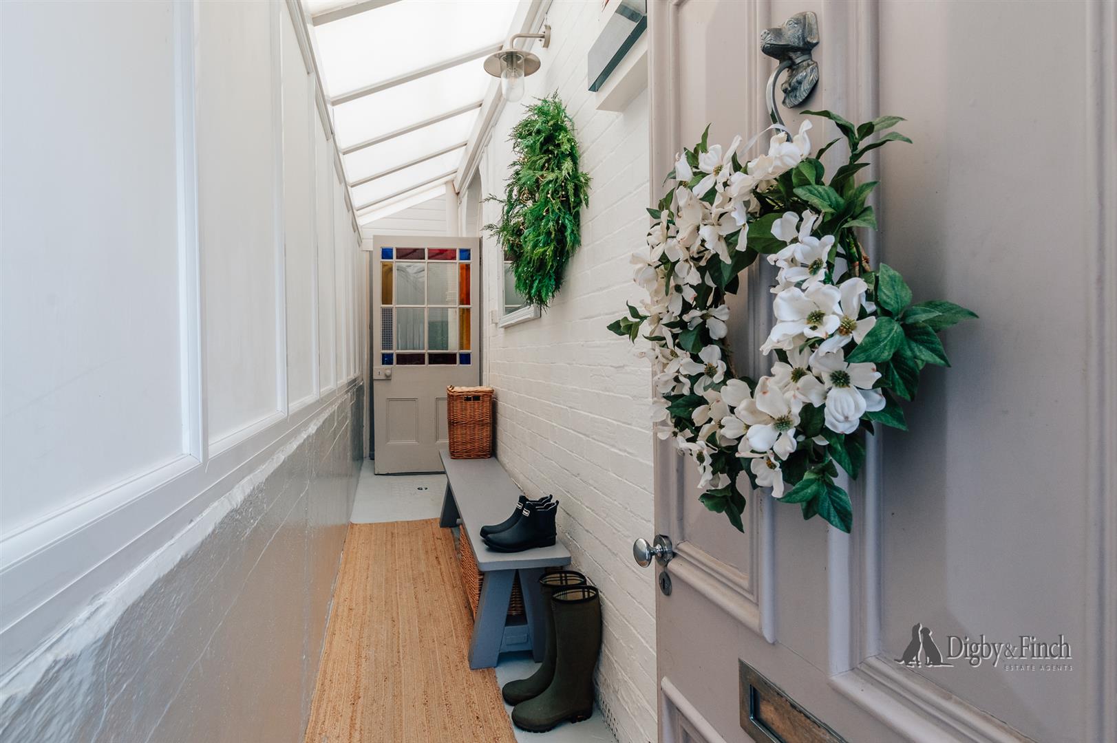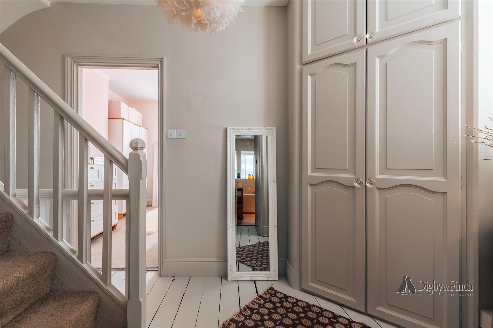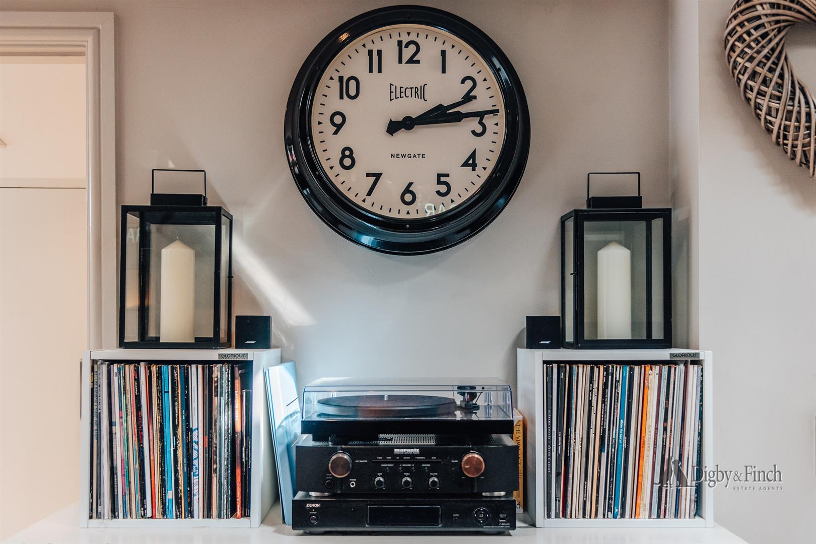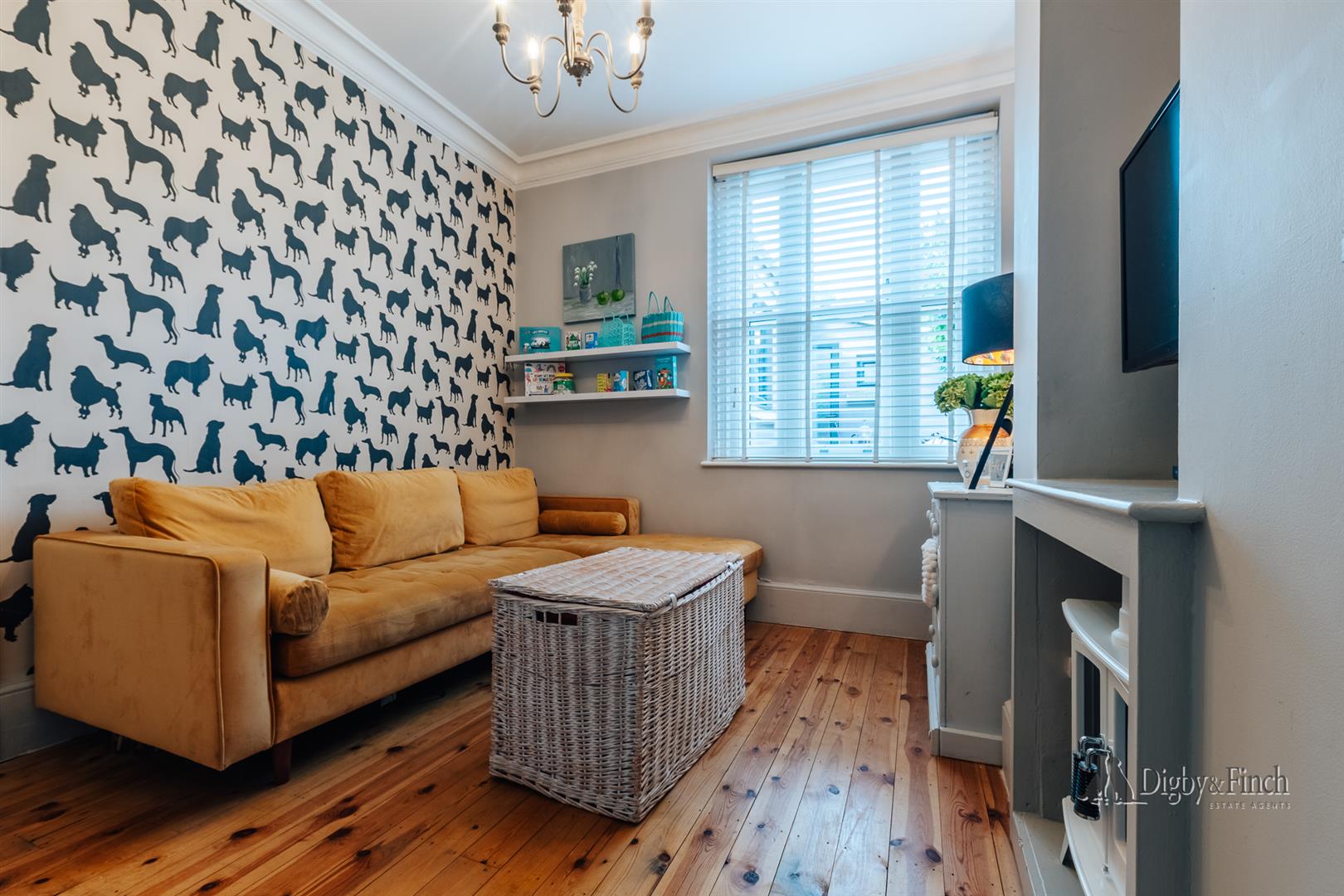 The Second Reception Room is currently arranged as a cosy TV snug, overlooking a pretty side courtyard through a traditional sash window. An open fireplace with electric stove adds warmth and character, while clever use of the understairs area provides a bespoke desk and shelving—ideal for working from home or creative pursuits.