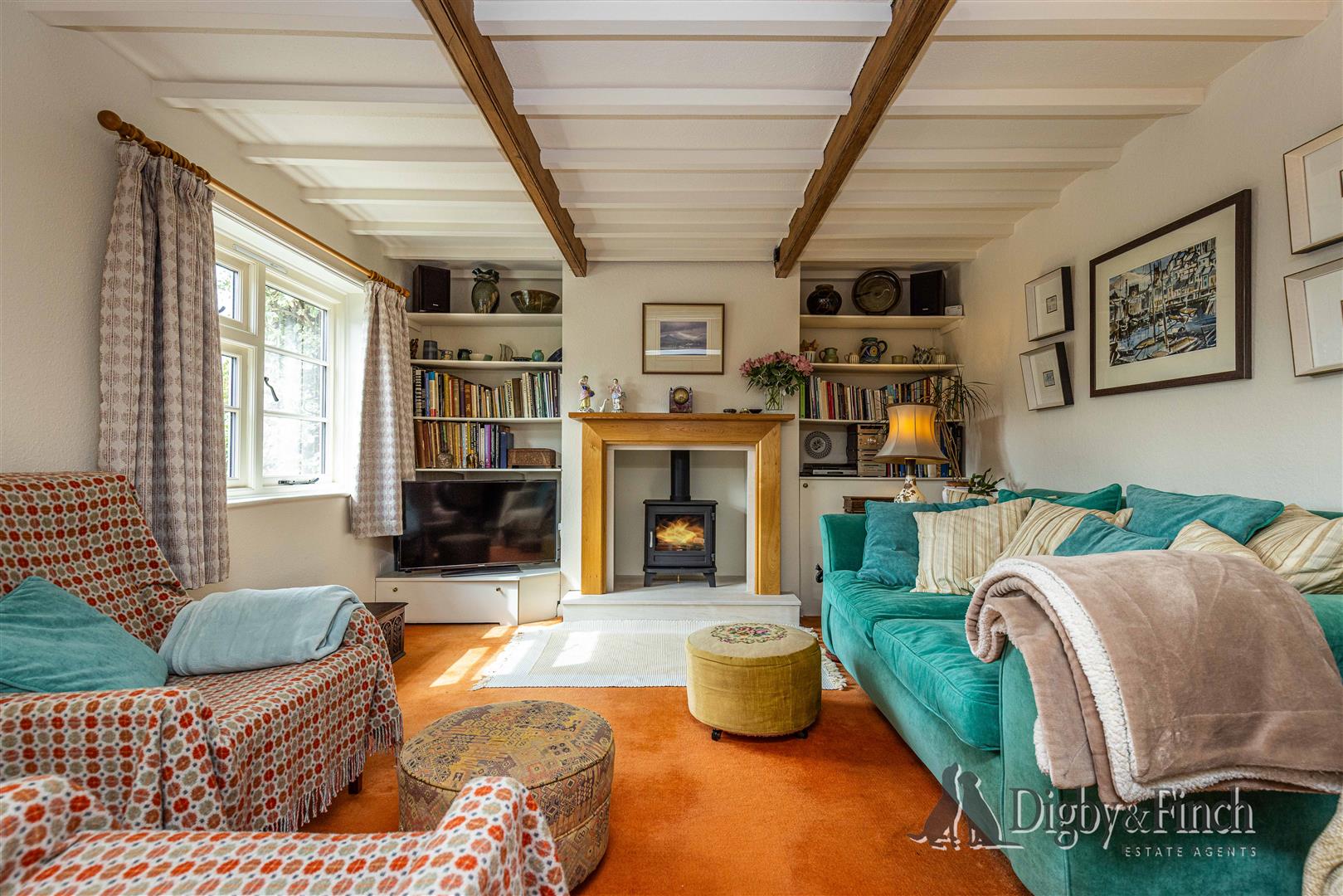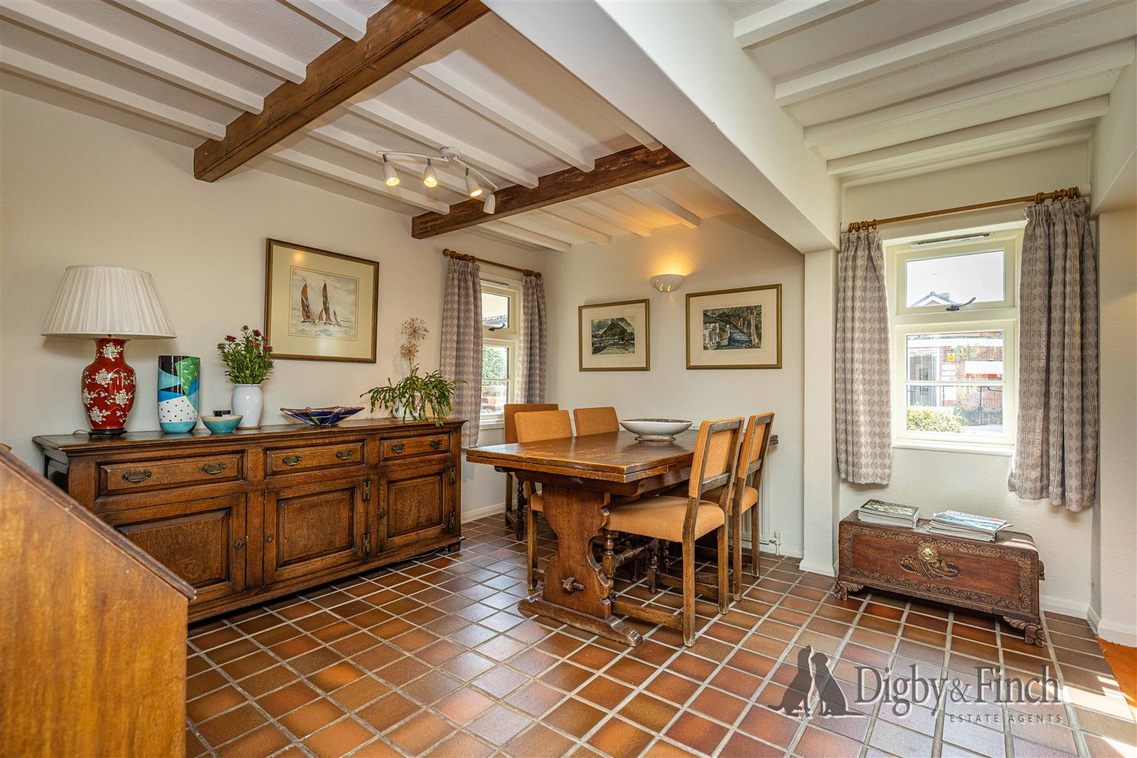 The open-plan sitting and dining room spans the entire front of the house. The dining area features a continuation of the tiled flooring, while the sitting area is carpeted, giving a natural division between the two spaces. Character is added by exposed beams, while the sitting area is further enhanced by a log-effect gas fire set within a wooden surround with a stone hearth, flanked by fitted shelving. Windows to the front elevation flood the space with natural light.