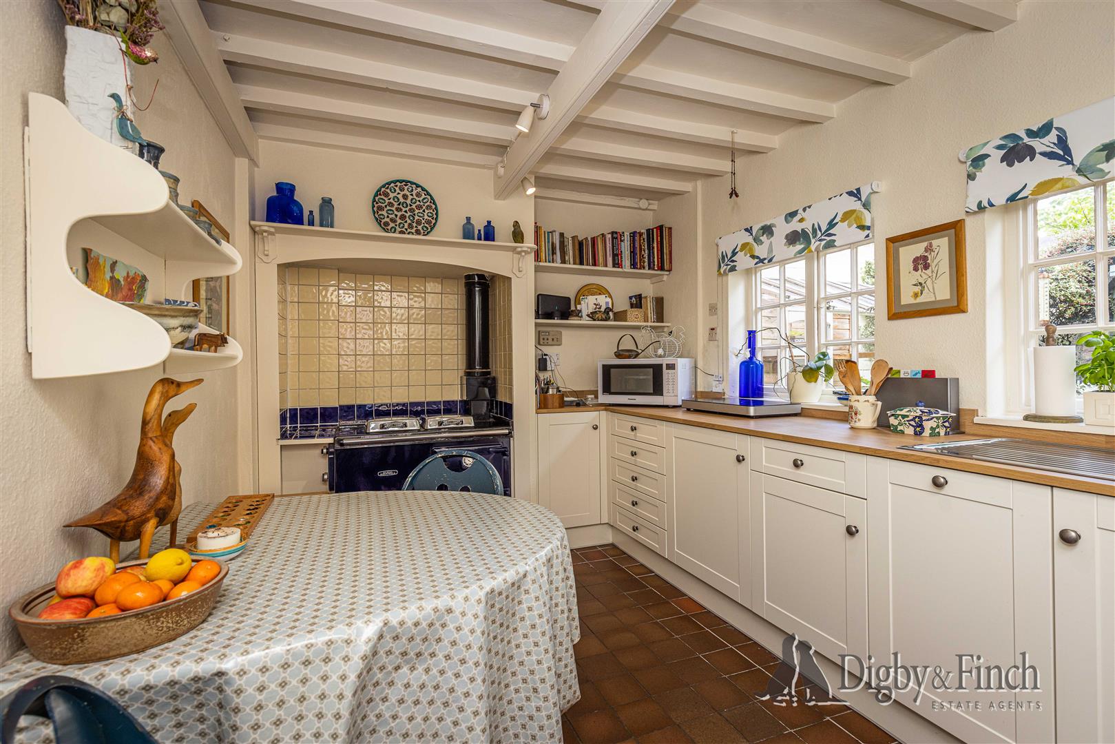 The kitchen is well appointed with modern off-white shaker-style base units by Wren, installed just last year. These are complemented by wood-effect worktops and a tiled floor, with exposed beams above adding period charm. There is ample storage throughout, along with a fitted slimline dishwasher and a stainless-steel single bowl sink with drainer. A Rayburn AGA provides both cooking facilities and central heating for the home.