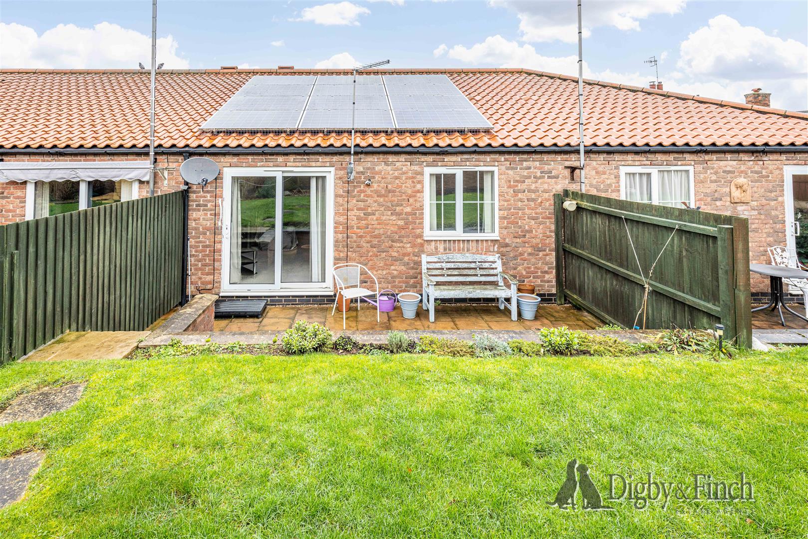 The property is approached via a shared communal parking area, with a pathway leading to the bungalows positioned to the rear of the site. To the rear of the bungalow is a private patio area, separated from neighbouring terraces by fencing to provide a degree of privacy. Steps lead up from the patio to the communal lawn, which is laid mainly to grass and enclosed by a rear boundary wall. A pathway runs to the far end of the lawn where there is a hardstanding area with a shed, offering additional practical outdoor storage.