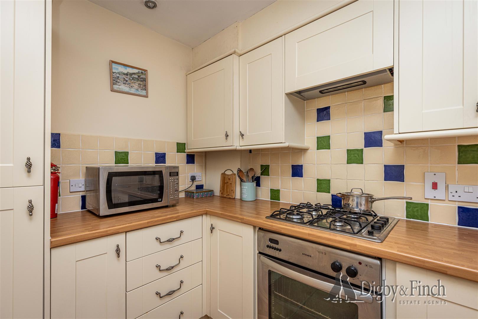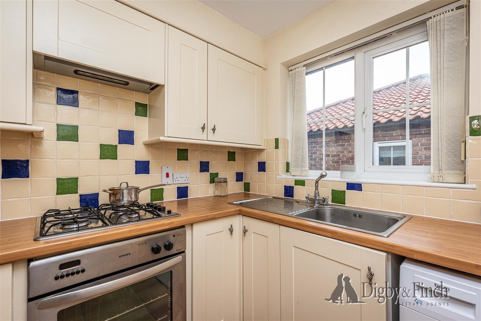 Located to the front of the property, the kitchen is fitted with a generous range of units providing ample storage. The room features tiled flooring, cream shaker-style cupboards, tiled splashbacks and laminate worktops. A single-bowl stainless steel sink with draining board is positioned beneath a window overlooking the front. Integrated appliances include a fridge/freezer, along with a Stoves single oven and four-ring gas hob with extractor fan above. There is undercounter space for a washing machine, and a corner cupboard discreetly houses the boiler.