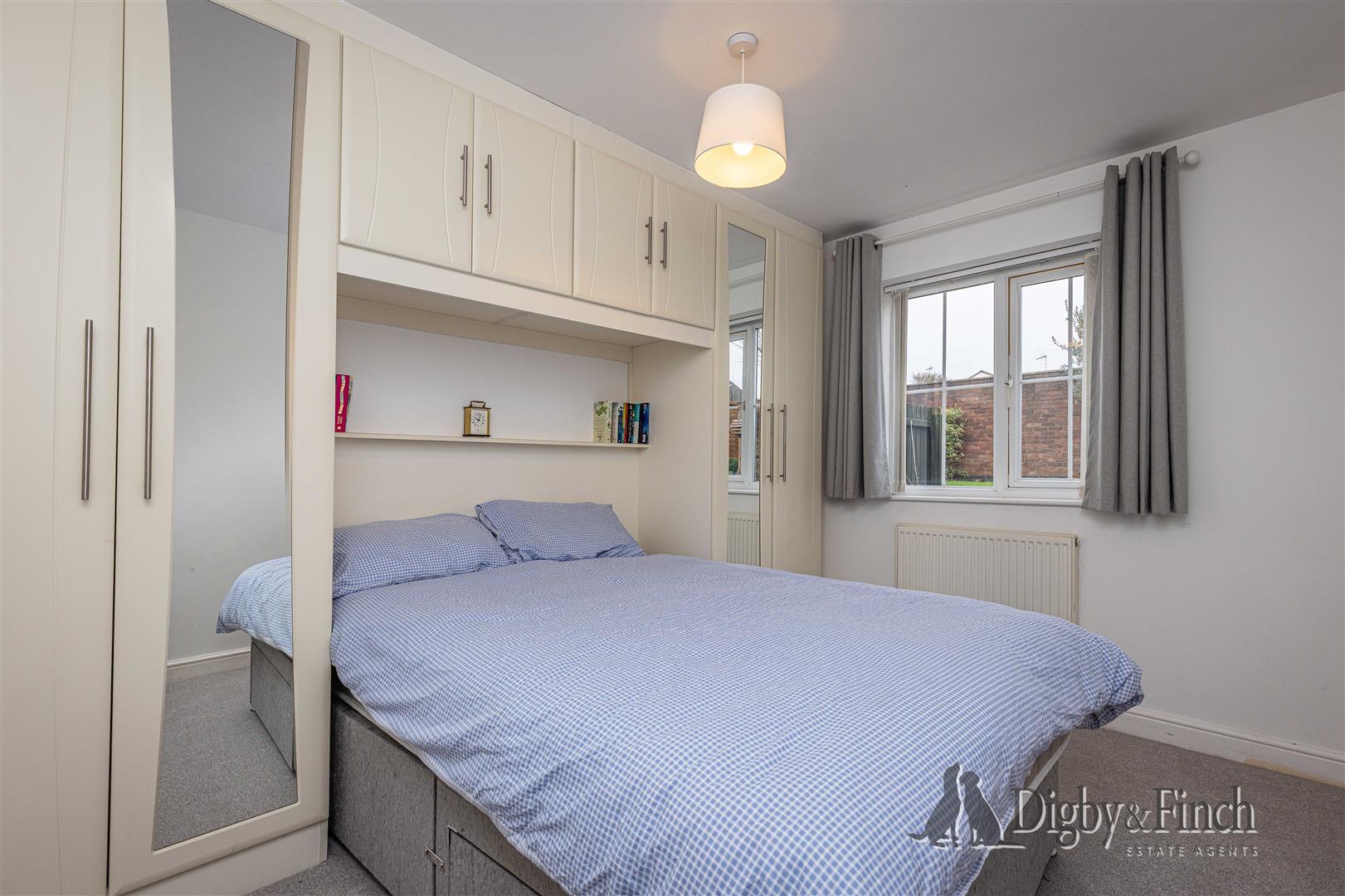 The primary bedroom is situated to the rear of the property and enjoys views over the garden. The room benefits from fitted wardrobes which frame the space for a double bed, creating a comfortable and well-organised sleeping area.