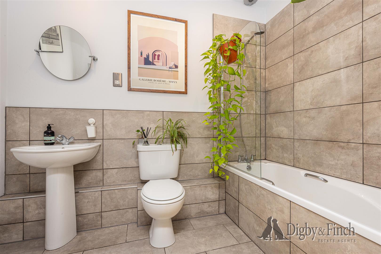 Completing the accommodation is the main bathroom, which has been fitted with matching floor and wall tiling for a cohesive and elegant look. The suite includes a bath with a glass screen and shower over, a wash hand basin, WC, and a heated towel radiator, combining practicality with modern comfort.