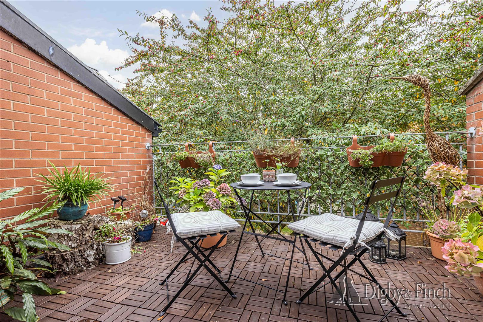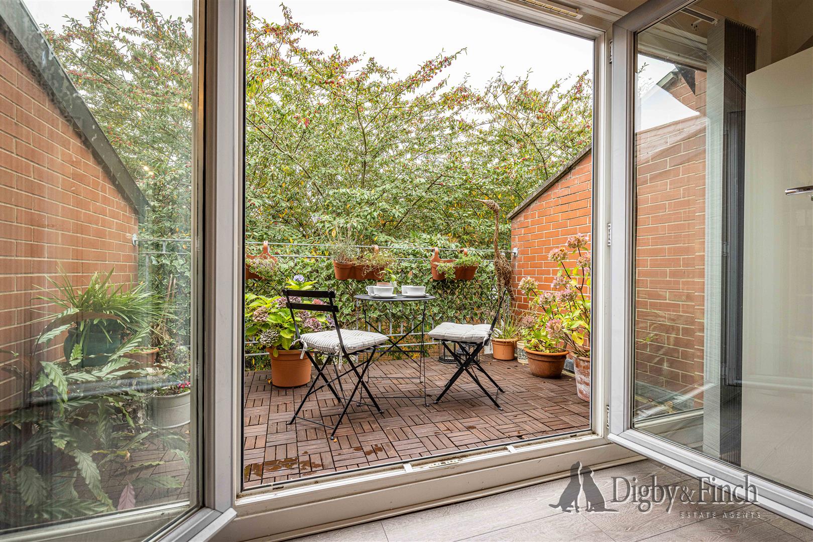 From the kitchen, French patio doors open onto a beautifully decked balcony—an inviting outdoor retreat ideal for enjoying morning coffee or evening drinks. The balcony is perfectly sized for a bistro set and potted plants, and is afforded an excellent degree of privacy by a nearby mature tree, which does not block the light while maintaining a pleasant sense of seclusion from those on the ground.