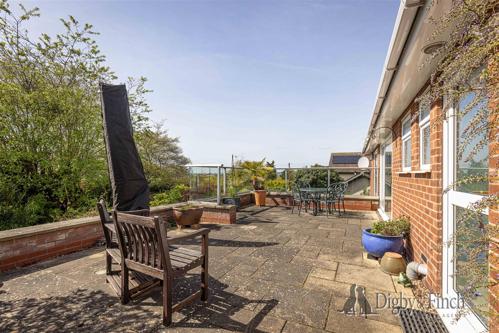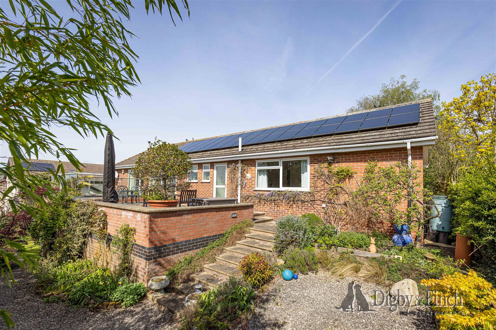 The rear garden has been thoughtfully arranged to make the most of the elevated position and far-reaching views. A patio area immediately to the rear of the bungalow provides an ideal space for outdoor seating and dining.
