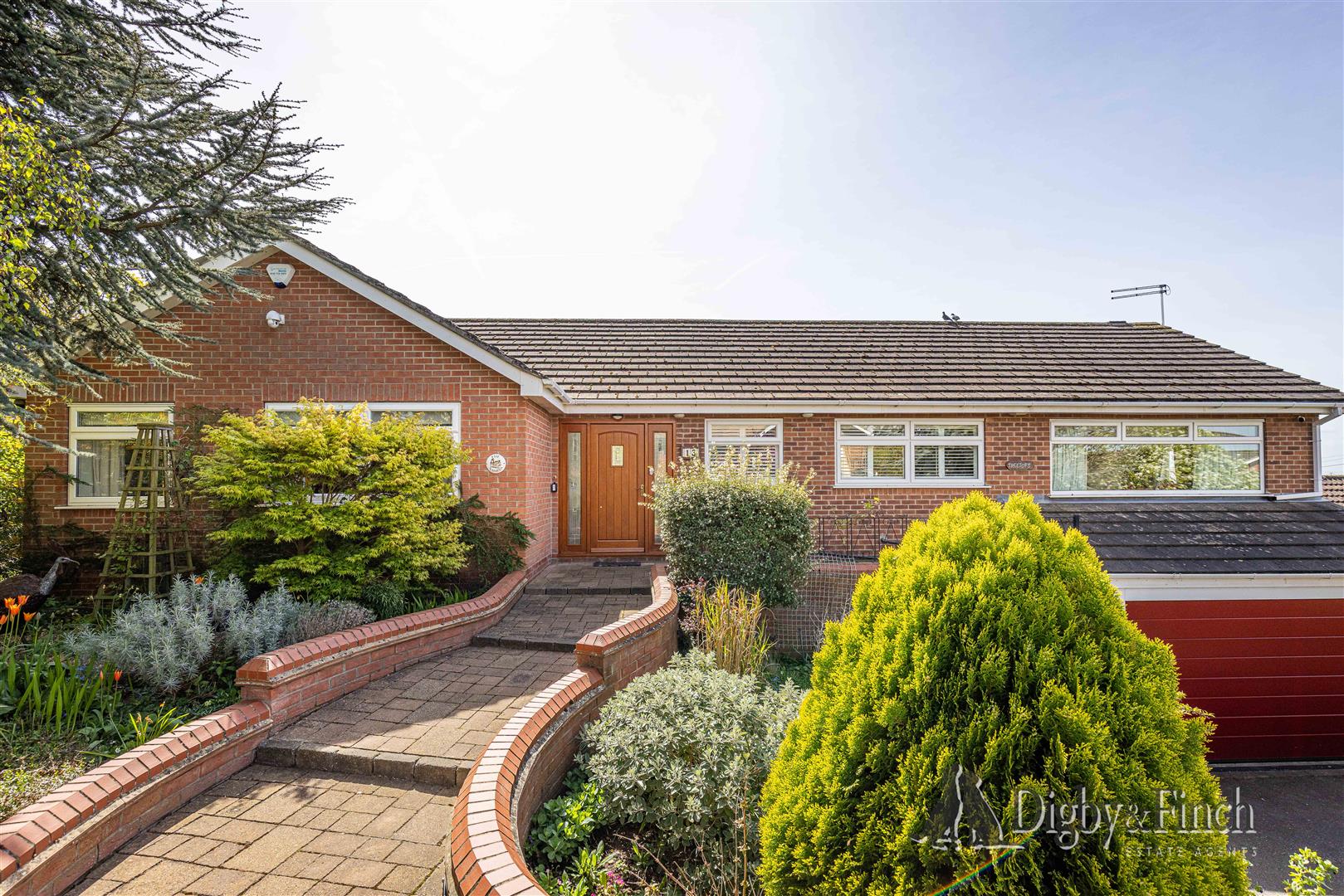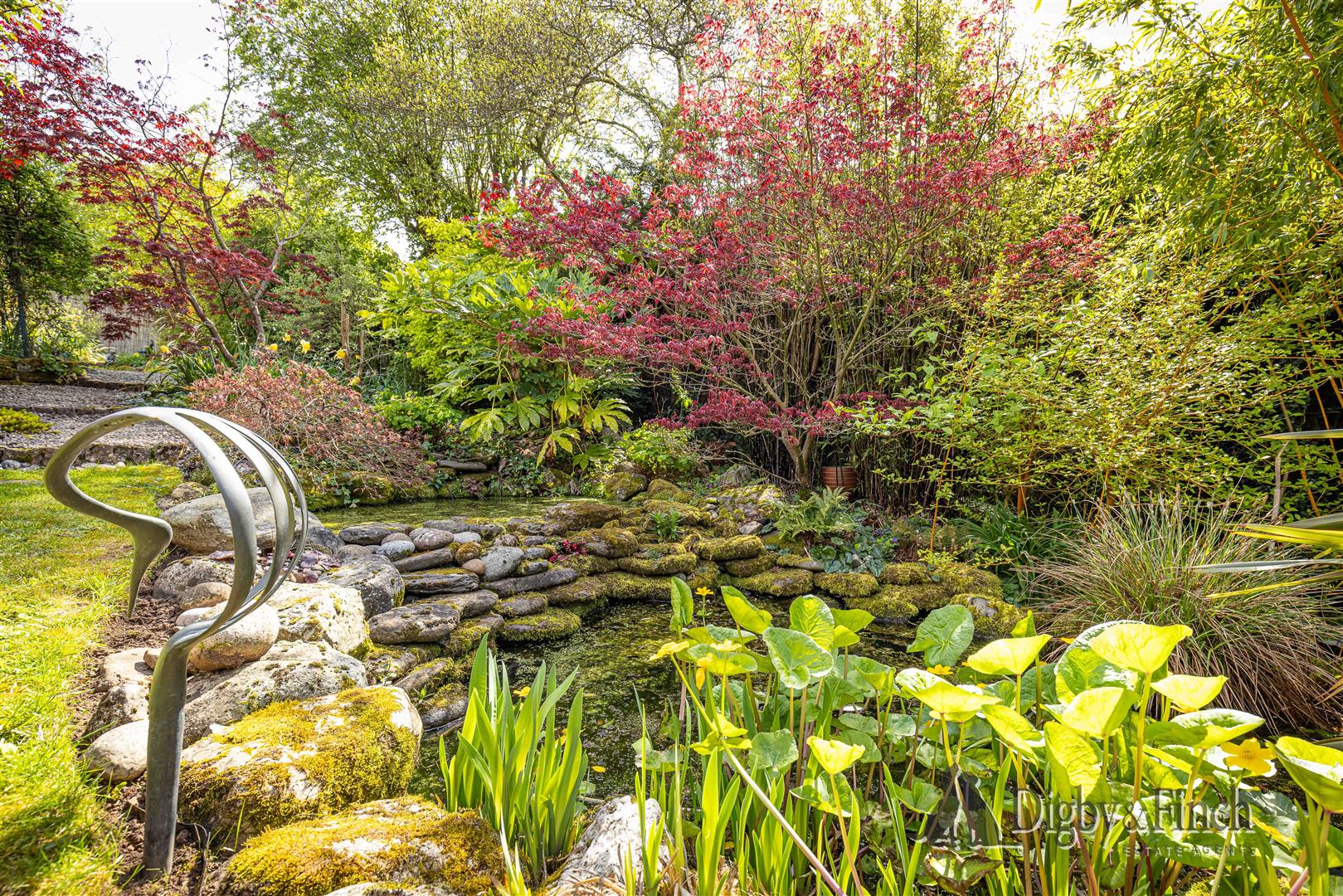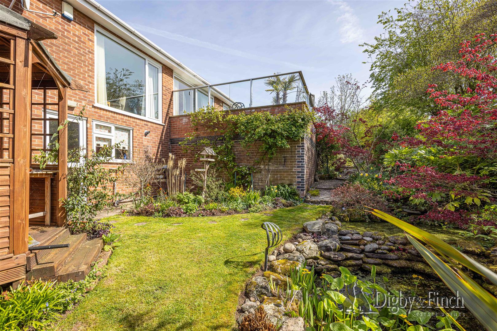- Landscaped rear garden with patio, lawn, pond, double garage, and ample driveway parking.