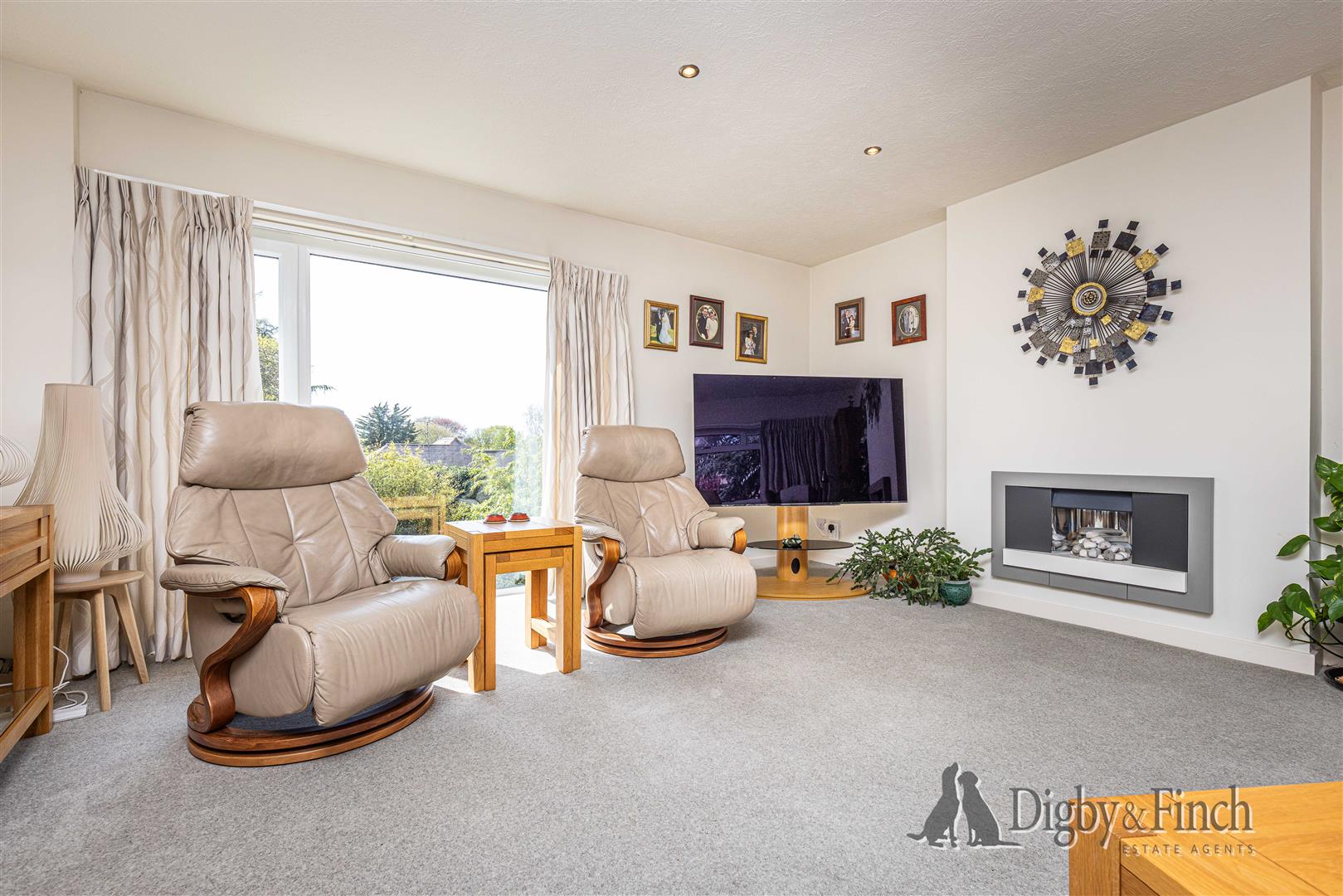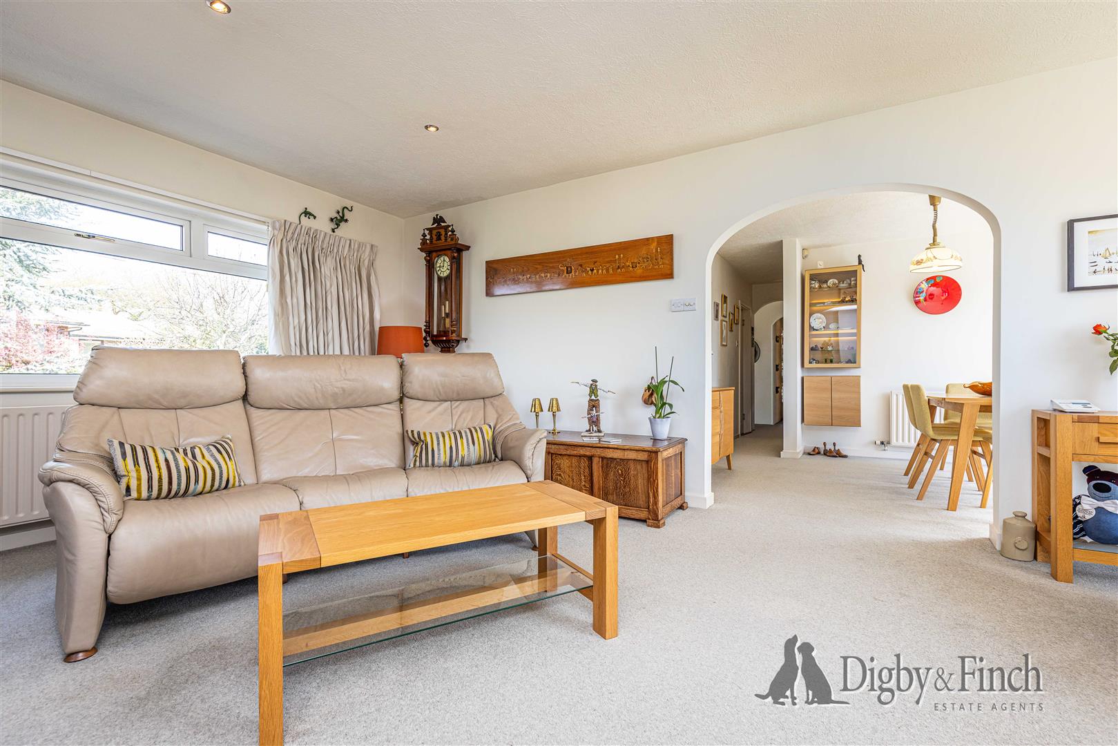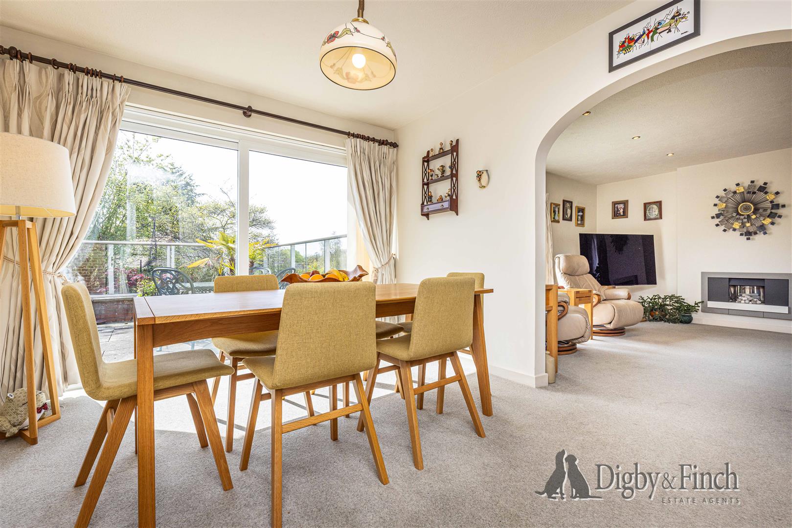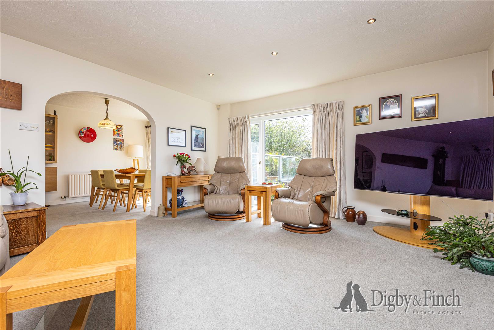 The hall opens into a spacious open plan dining and sitting area, subtly divided by an archway to create distinct yet connected spaces. This generously proportioned room is filled with natural light and offers ample space for a variety of furniture arrangements. The dining area benefits from sliding glass doors leading directly onto the rear patio, creating an excellent connection between indoor and outdoor living, ideal for entertaining. The sitting room enjoys a triple aspect, with windows to the front, side, and rear, including a large picture window that frames the far-reaching views. A modern gas fire provides a central focal point.