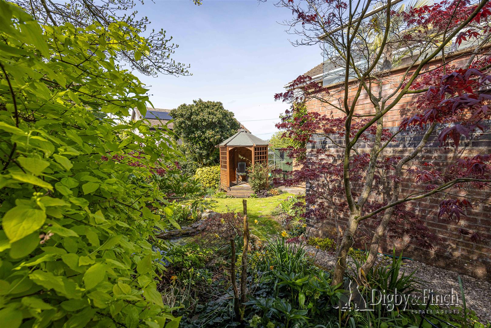 The garden then slopes down around the rear of the patio to a lower section, predominantly laid to lawn, where a pond and established planting create an attractive and well-established setting. A charming open summer house offers a shaded seating area overlooking the pond, providing a serene and relaxing spot within the garden.
