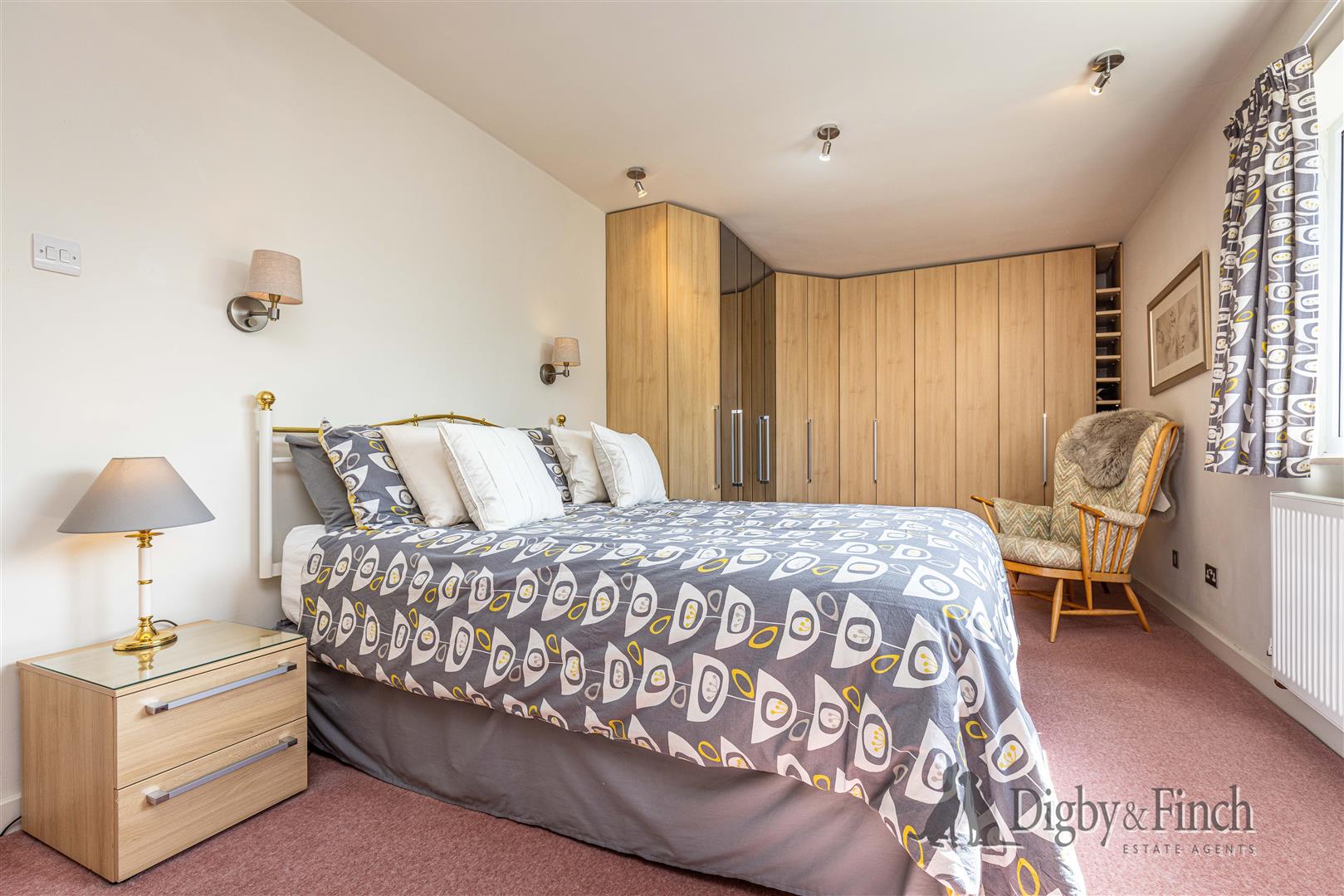 The primary bedroom is situated to the rear of the property and is particularly spacious, with room for a king size bed and a dressing area. It features an extensive range of Hopewells fitted wardrobes and drawers, providing excellent storage.