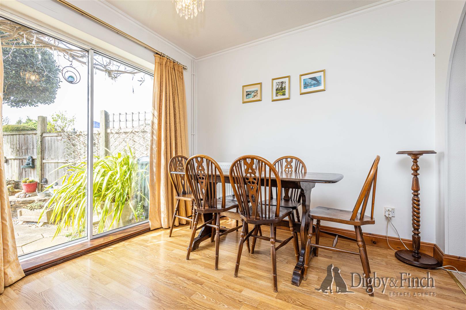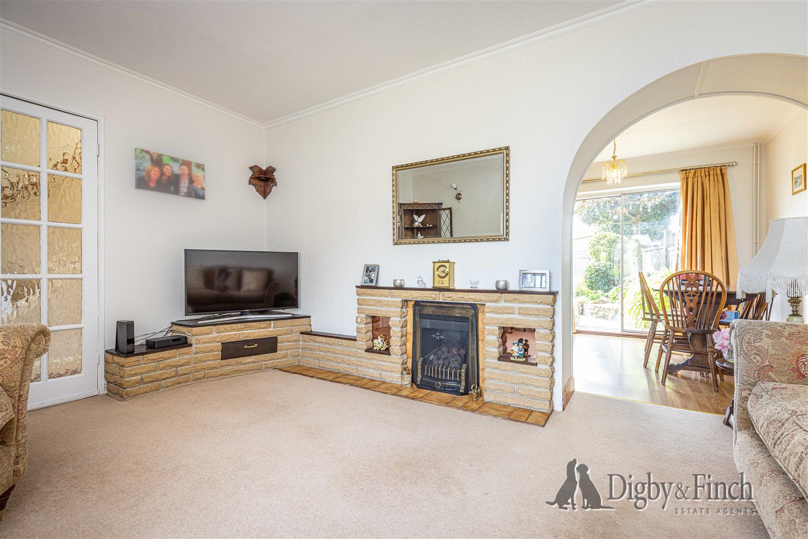 The sitting room is positioned to the front of the property and features a gas fire set within a stone-effect surround, creating an attractive focal point. An archway leads through to the dining area at the rear, where sliding glass doors open onto one of the patio seating areas. Together, these spaces benefit from a dual aspect, allowing for an abundance of natural light and a seamless flow, ideal for both everyday living and entertaining.