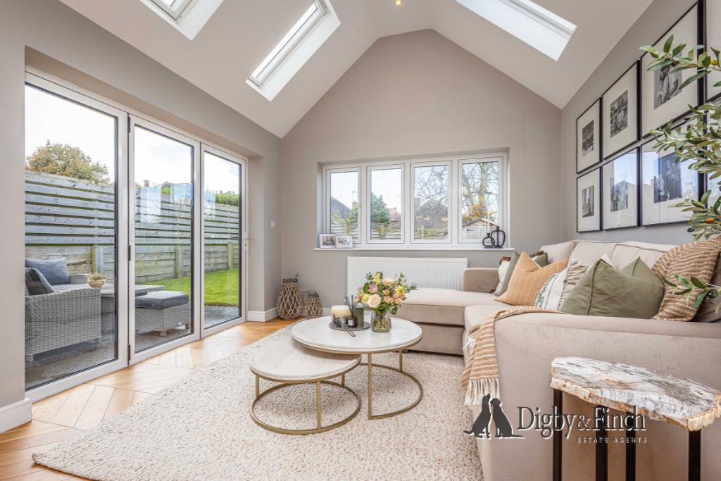 - Stunning vaulted garden room with bifold doors creating seamless indoor-outdoor living.