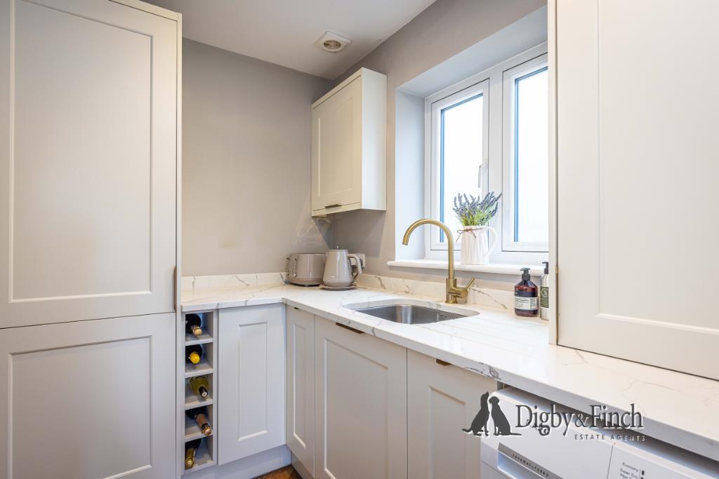 A door from the kitchen leads into the utility room, which continues the same high-quality finish with matching cabinetry and worktops. There is an integrated full-height freezer, a concealed boiler cupboard, and an inset stainless steel sink with drainer grooves and gold tap. Undercounter space is provided for a washing machine.