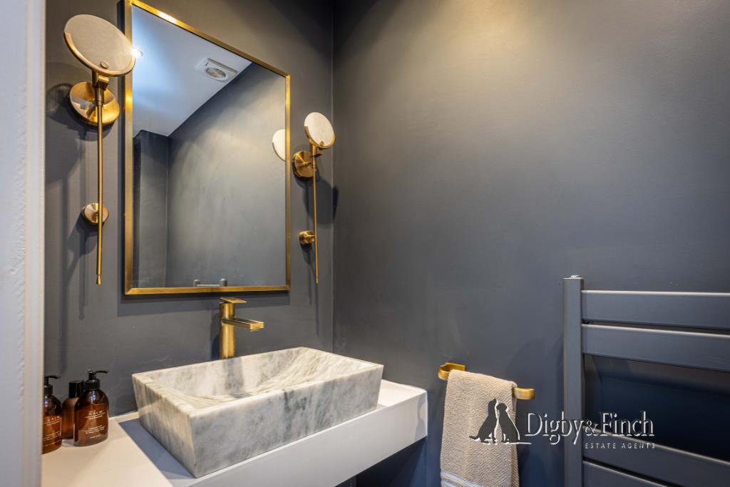 The cloakroom is finished to an exceptional standard, featuring statement tiled flooring and fitted with a WC and a Lusso stone Carrara marble sink set with brushed gold fittings and taps. A heated towel radiator completes the space.
