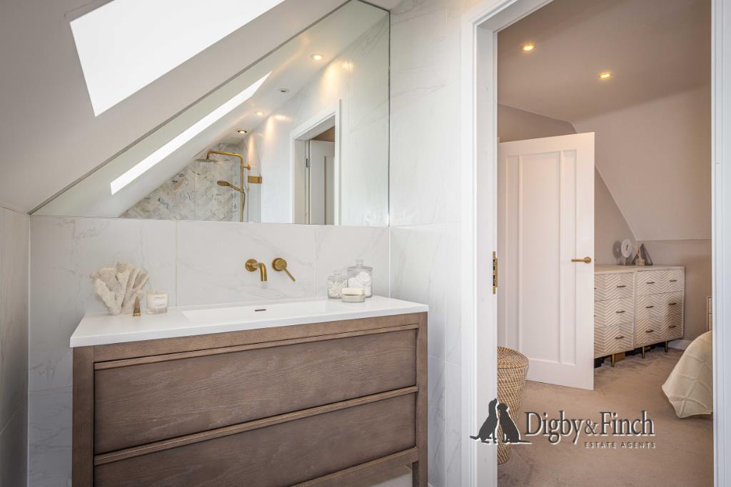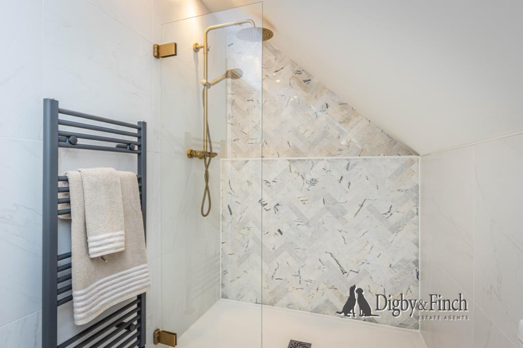 The ensuite is beautifully appointed with a walk-in shower featuring a glass screen and striking contrast tiling with an integrated shelf. Brushed gold rainfall and handheld shower fittings add a touch of luxury, while a Lusso stone worktop supports a basin atop a two-drawer vanity unit with mirror above. A WC and heated towel radiator complete the suite.
