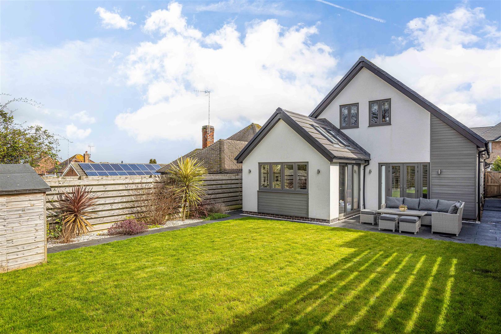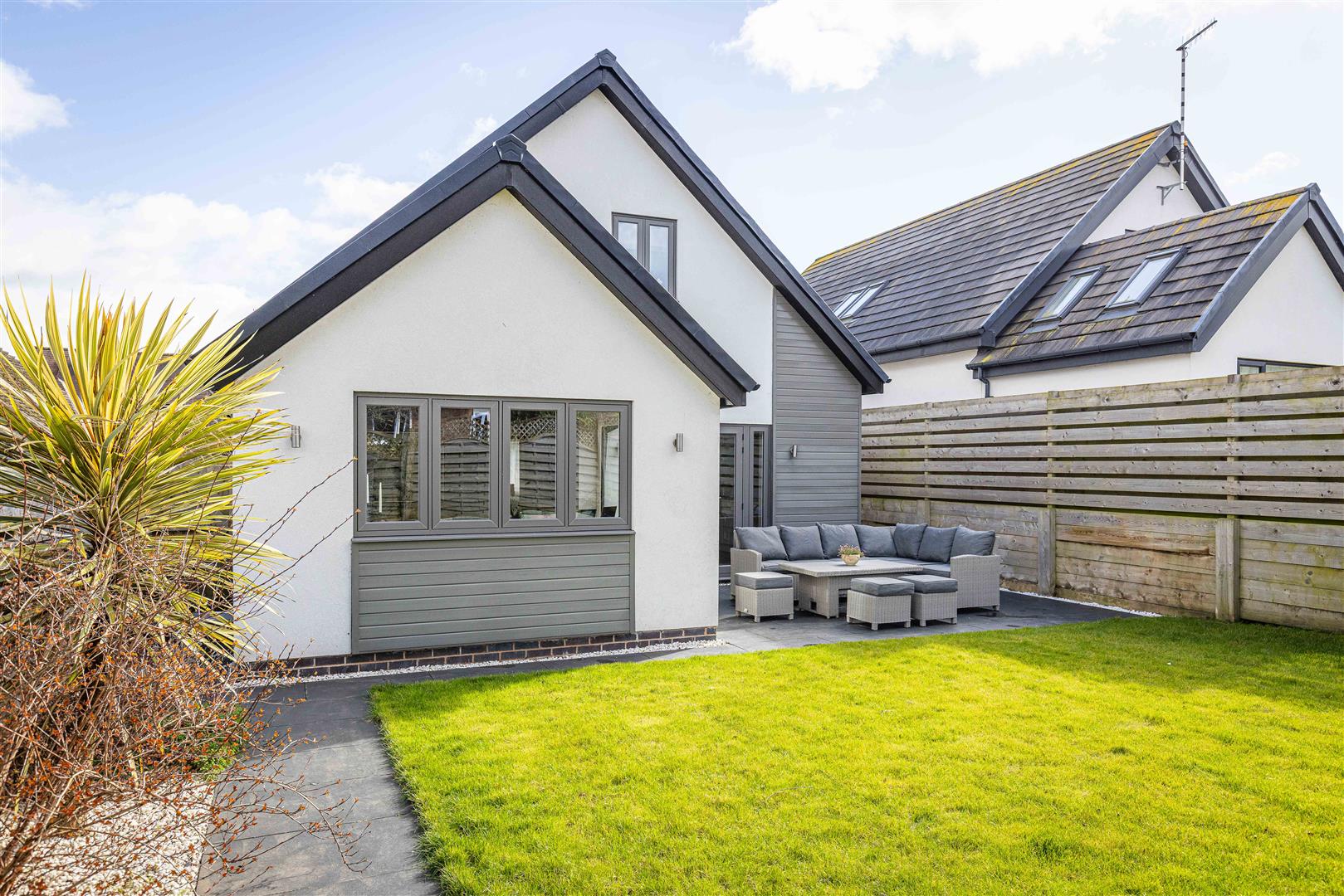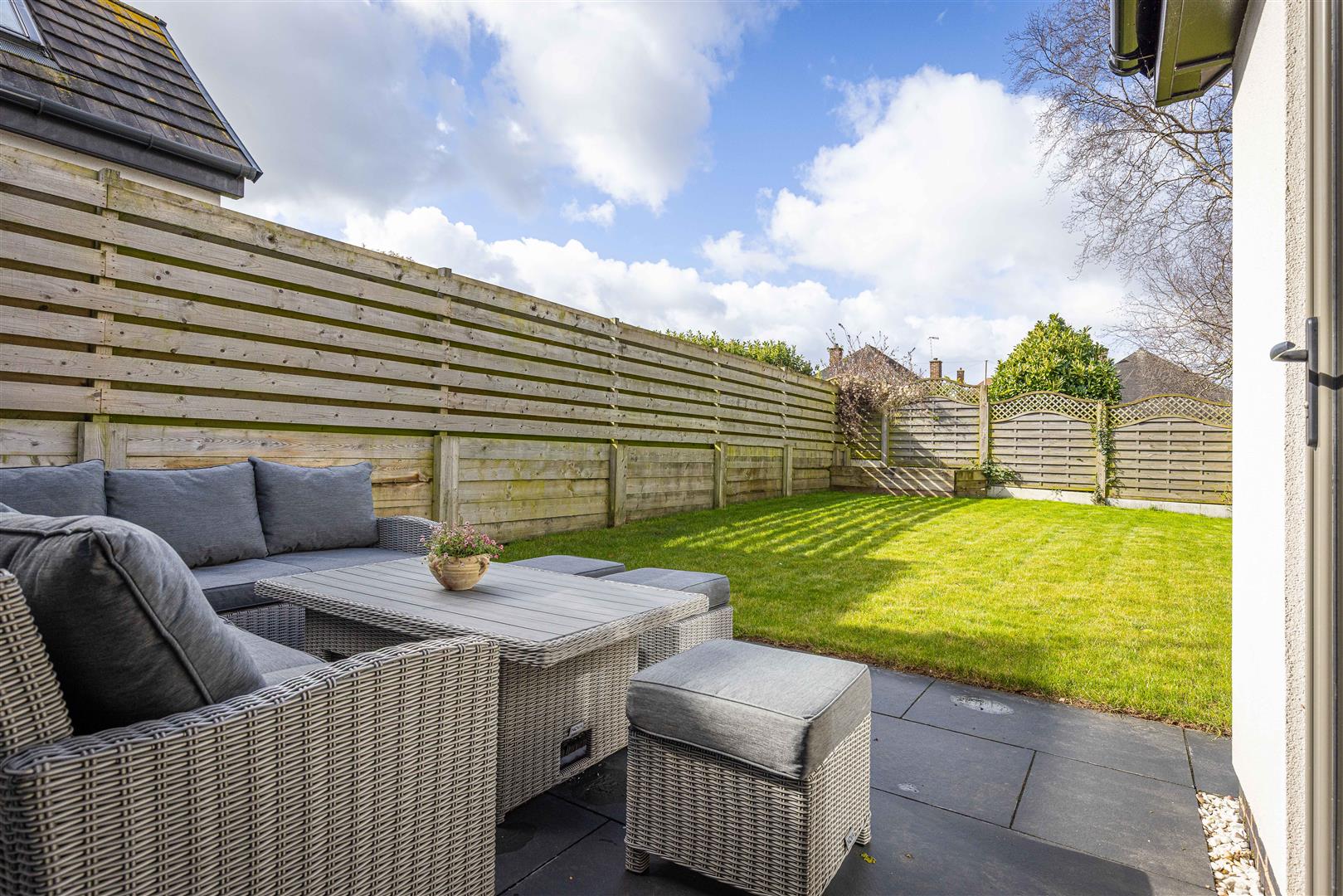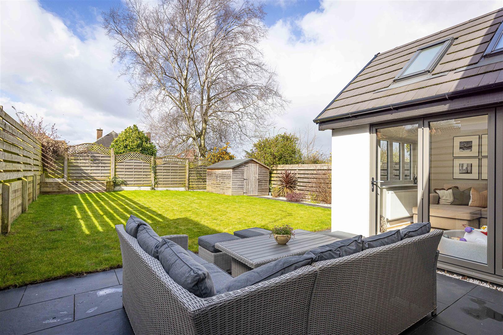The rear garden is fully enclosed with fenced boundaries and is predominantly laid to lawn, offering an ideal space for families. A generous patio area spans the rear of the house, perfectly suited for al fresco dining and entertaining, particularly given the seamless connection to the internal living space. Thoughtful box planting adds visual interest, while a garden shed provides practical external storage.