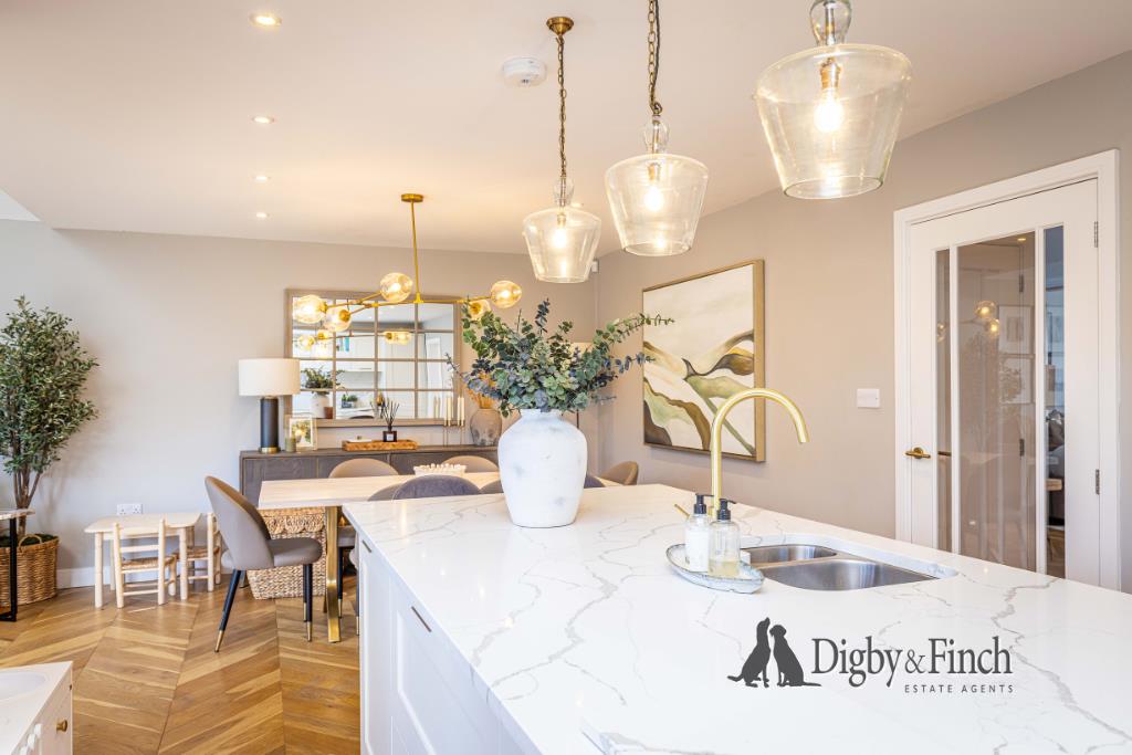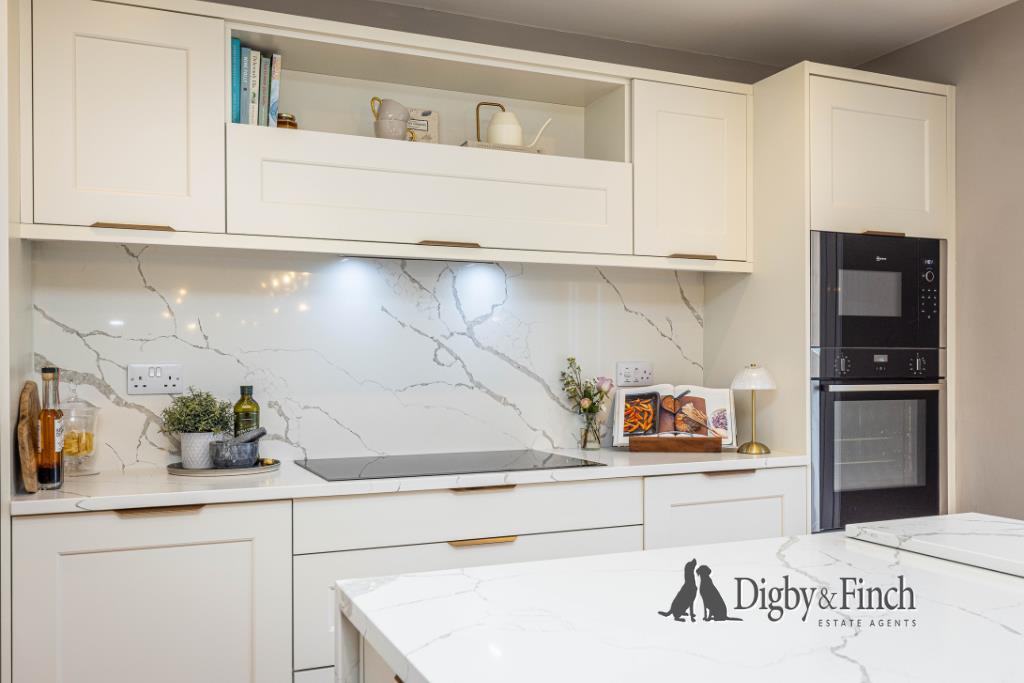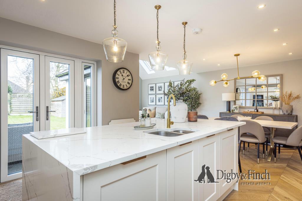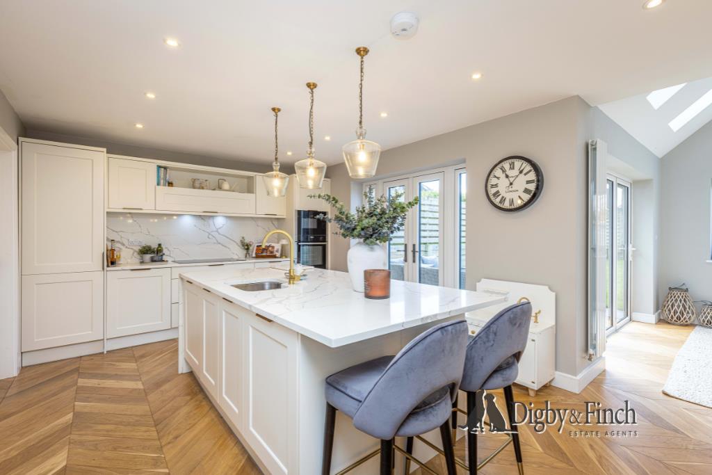 Spanning the full width of the rear elevation and arranged in an L-shape is the outstanding open plan living, dining kitchen—an exceptional space designed for modern family living and entertaining. The kitchen is beautifully appointed with porcelain shaker-style cabinetry, accented by brushed brass handles and complemented by Calacatta stone worktops and matching splashbacks. A central island provides breakfast bar seating for two and incorporates a one-and-a-half bowl sink with brushed gold mixer tap, integrated AEG dishwasher and refuse storage. A comprehensive range of integrated appliances includes a NEFF single oven, NEFF microwave, Siemens warming drawer, Siemens induction hob with extractor above, and a full-height fitted fridge. Patio doors open directly onto the rear terrace.