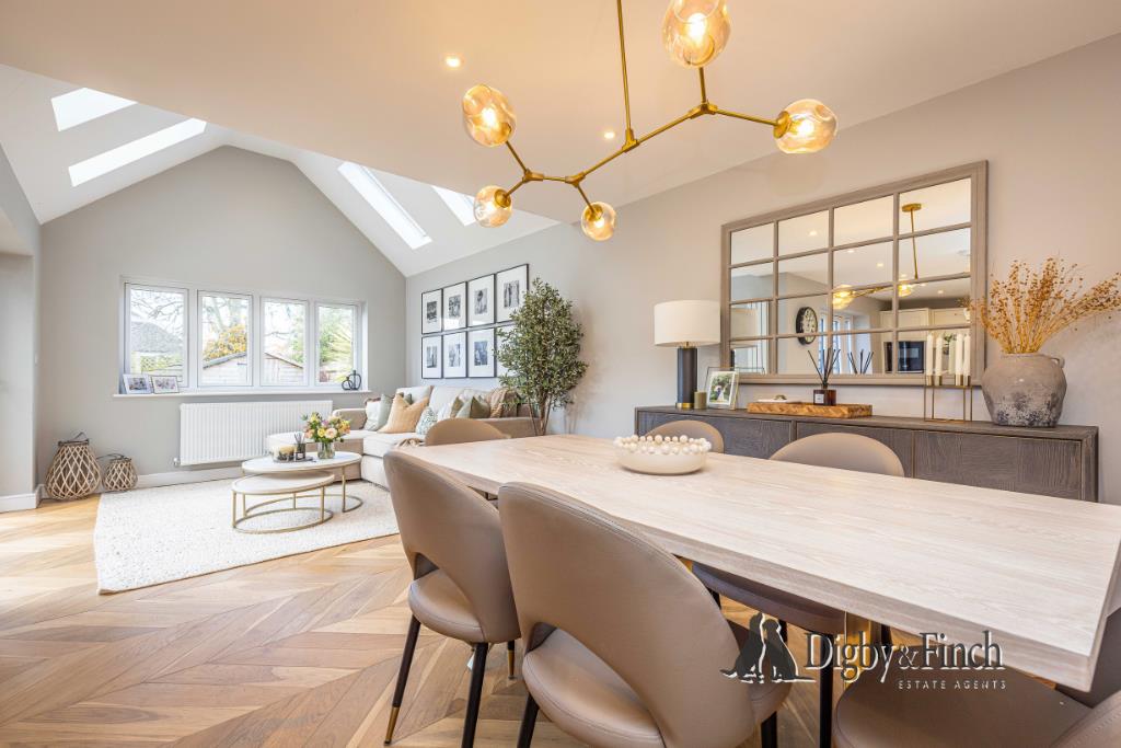 The dining area naturally connects the kitchen to the sitting area, which is designed as a delightful garden room. This space is enhanced by a vaulted ceiling and an abundance of natural light, with bifold doors opening onto the patio and additional glazing overlooking the garden, creating a seamless indoor-outdoor connection.