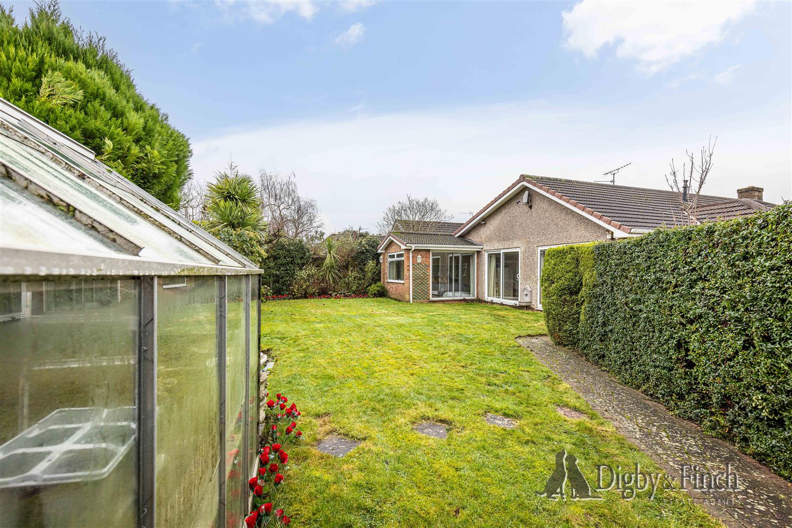 The rear garden is predominantly laid to lawn and enclosed by fenced boundaries, with established shrub and tree borders providing privacy and greenery. A hardstanding area to the rear of the garage houses a large greenhouse.