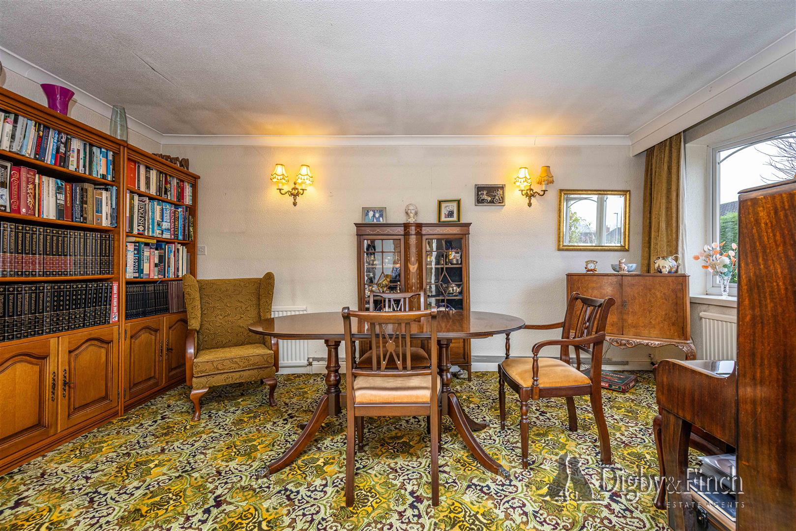 Adjacent to the kitchen, and accessible from both the main hallway and the sitting area, is the open plan sitting room with an archway leading through to the dining room. Both rooms are generously proportioned and enjoy large windows overlooking the front of the property. The sitting room features a substantial stone fireplace with gas fire, while the dining room benefits from a bay window, creating a bright and welcoming space ideal for entertaining.