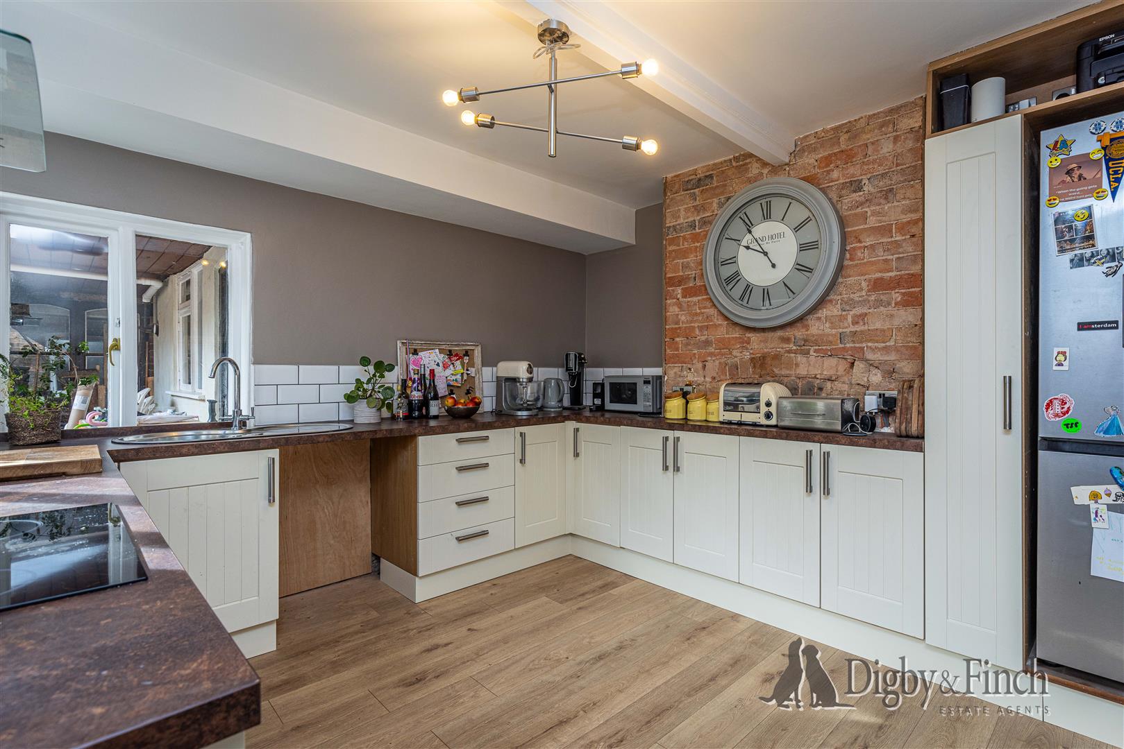 To the rear is a recently fitted kitchen, designed with both style and practicality in mind. It features a range of modern cream shaker-style base units with laminate stone-effect worktops, complemented by classic white subway-tiled backsplashes and stainless steel hardware. A single oven, four-ring electric hob and extractor are integrated, with two under-counter spaces ideal for white goods such as a dishwasher and washing machine. There is also an enclosed space designed to house a freestanding fridge-freezer, with an adjacent tall storage cupboard. An exposed brick wall adds a touch of character, while the windows overlook the courtyard, bringing in natural light.