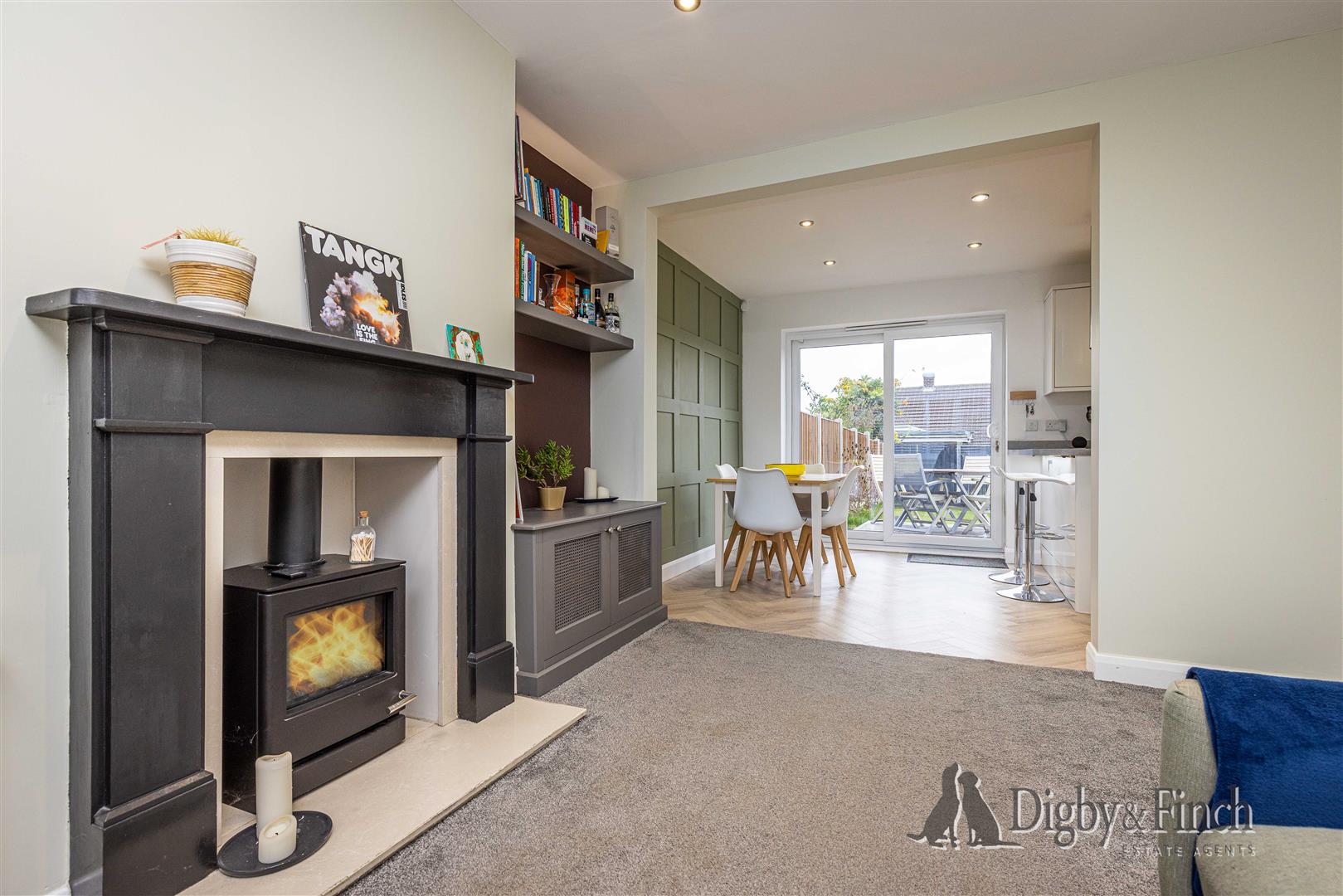 To the front of the property, the living area is clearly defined by a change in flooring to soft carpet, giving the space a cosy and inviting feel. A feature electric log burner set on a stone hearth within the chimney breast provides a charming focal point, while bespoke low-level fitted cabinetry on either side offers excellent storage and a practical space for media equipment. Shutters to the front window complete this beautifully designed room.