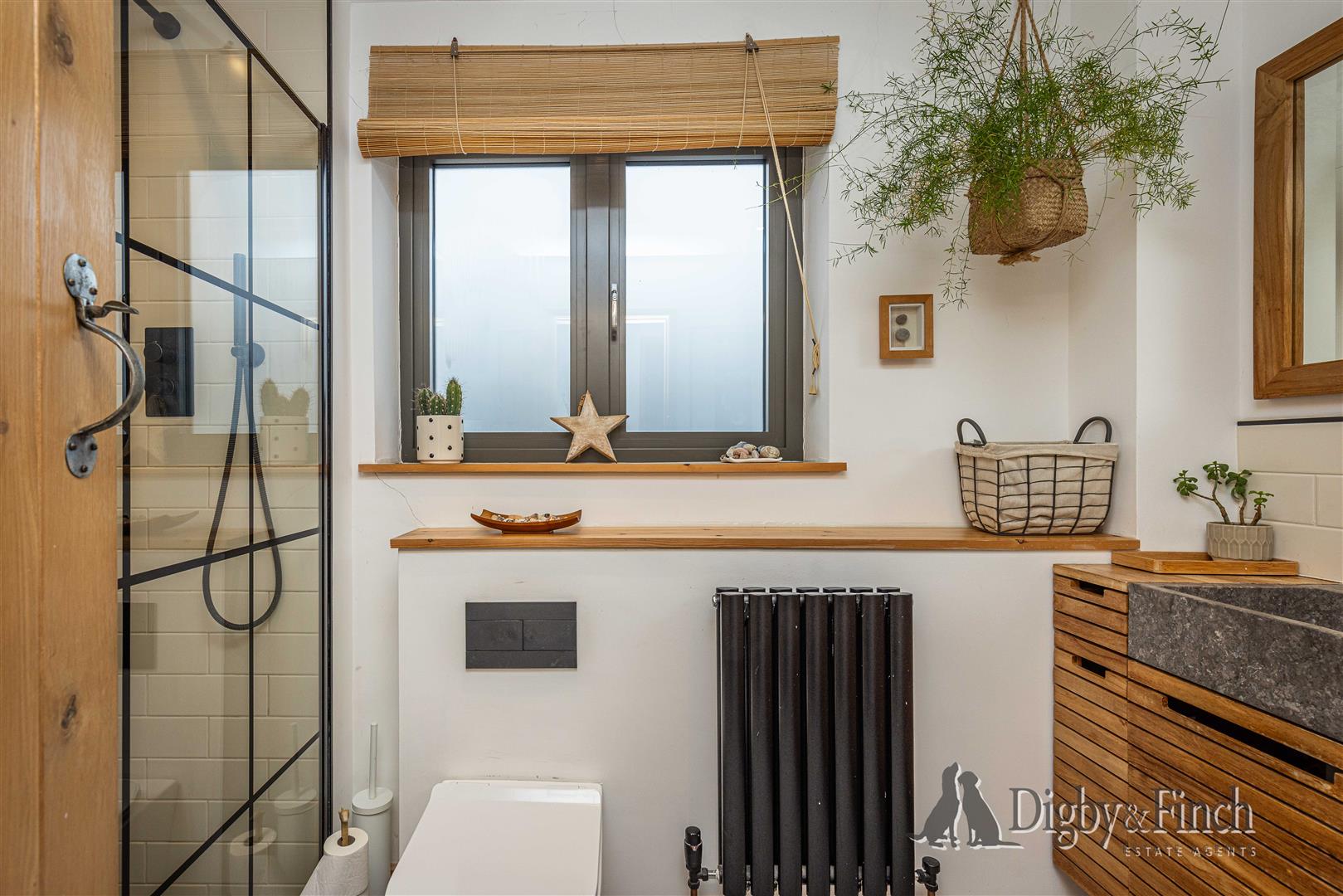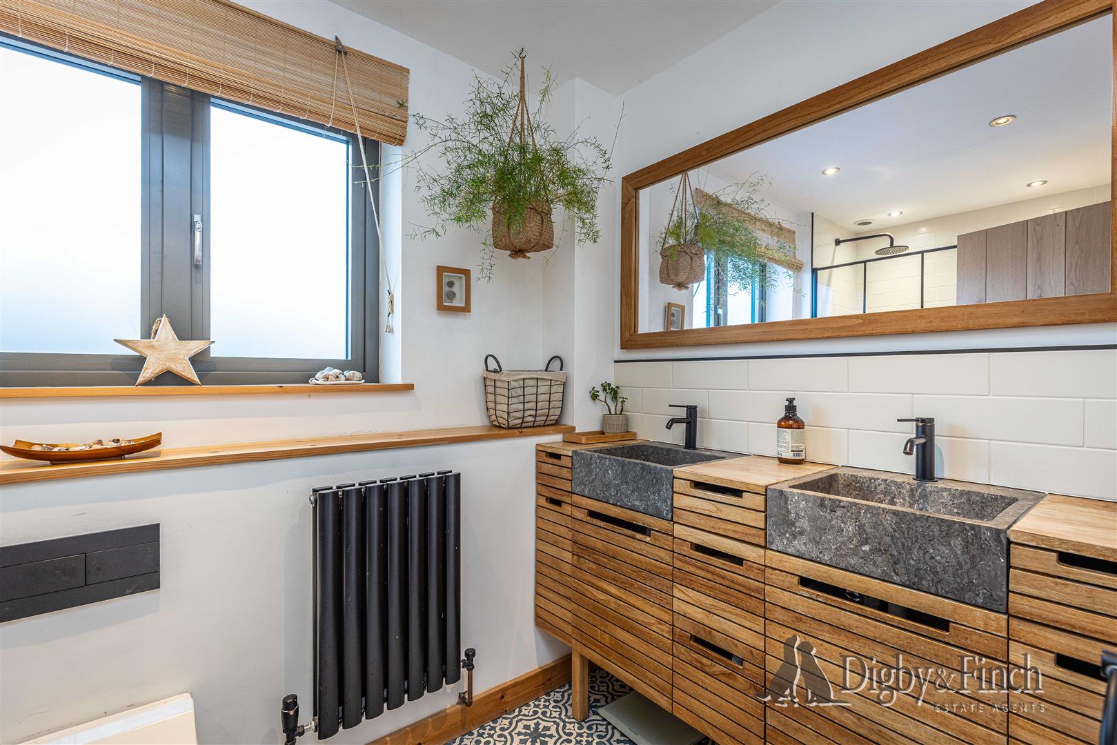 The shower room has been stylishly finished with attractive feature tile flooring and carefully selected contemporary fittings. A walk-in shower is finished with contrasting black tiles and black fixings to the glass screen and rainfall showerhead, creating a striking modern aesthetic. Twin marble sinks are set within a wooden vanity unit which provides excellent storage beneath, alongside a WC.