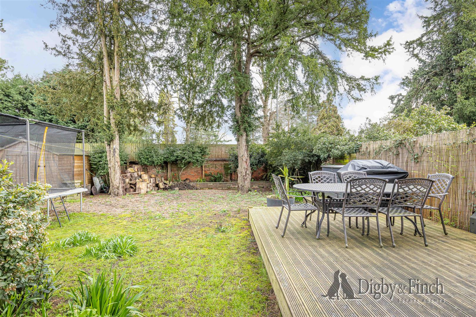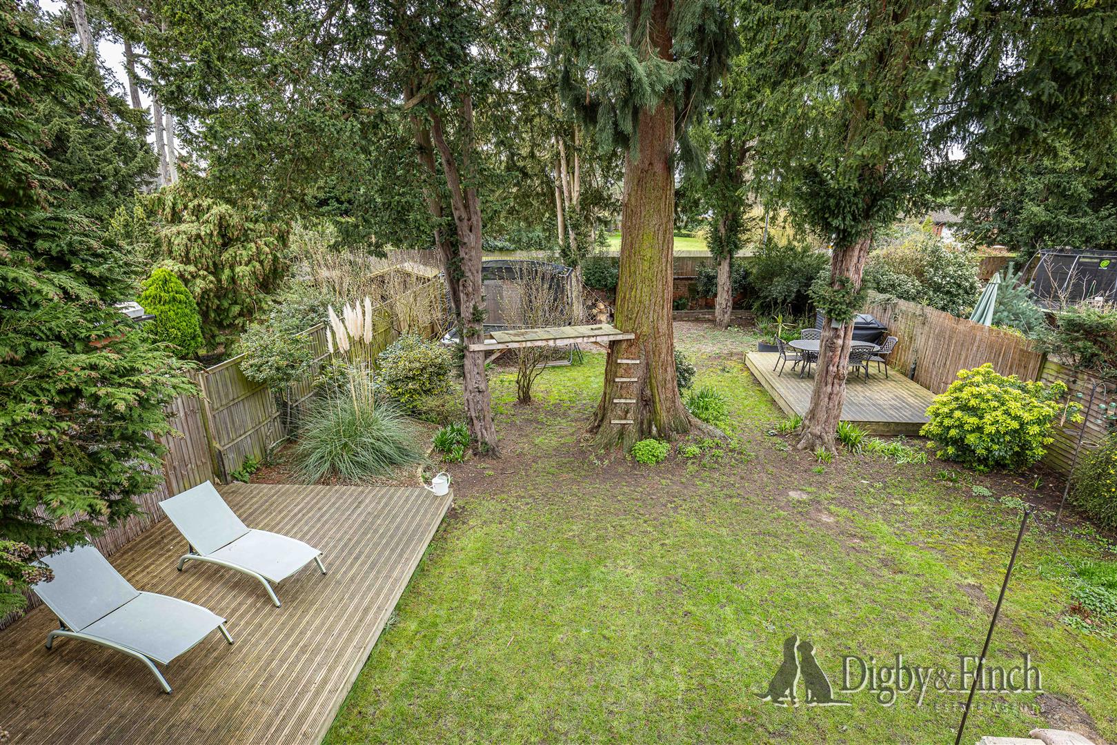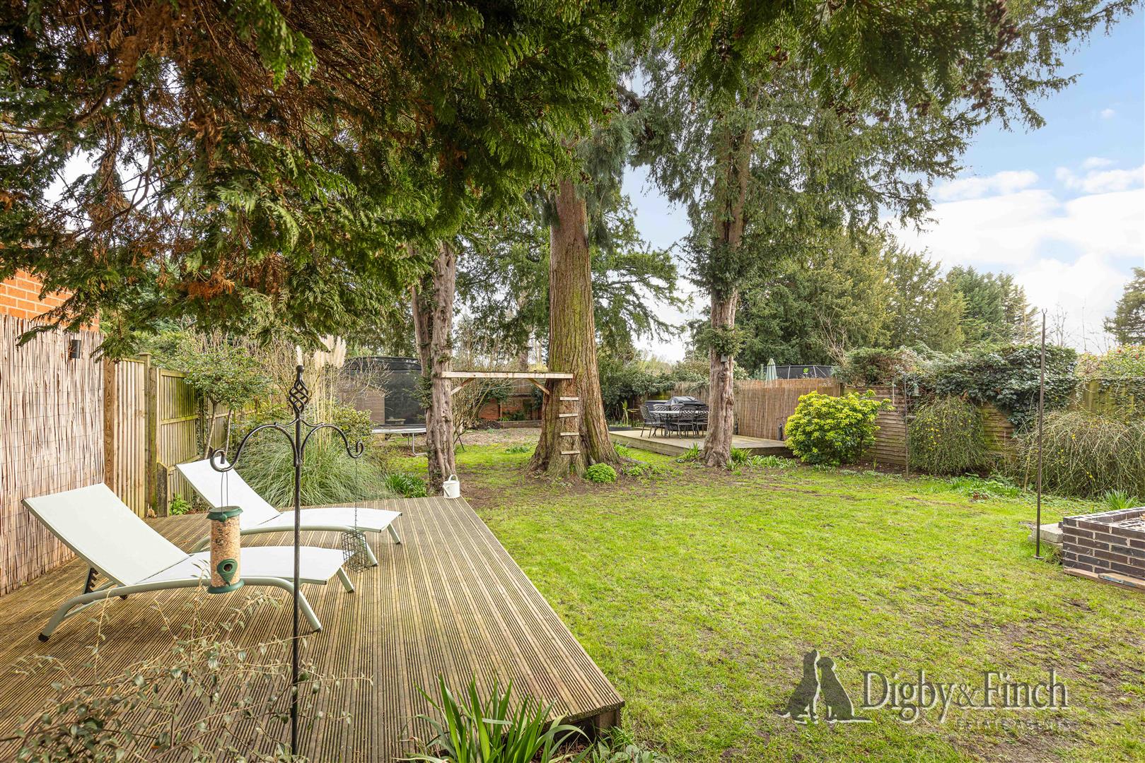 The rear garden is a particularly attractive feature of the property, offering a generous outdoor space well suited to both relaxation and entertaining. The garden is predominantly laid to lawn and is dotted with attractive yew trees, a charming nod to the street’s name, Yew Tree Close. A magnificent Redwood tree stands proudly at the centre of the garden, creating a striking focal point.