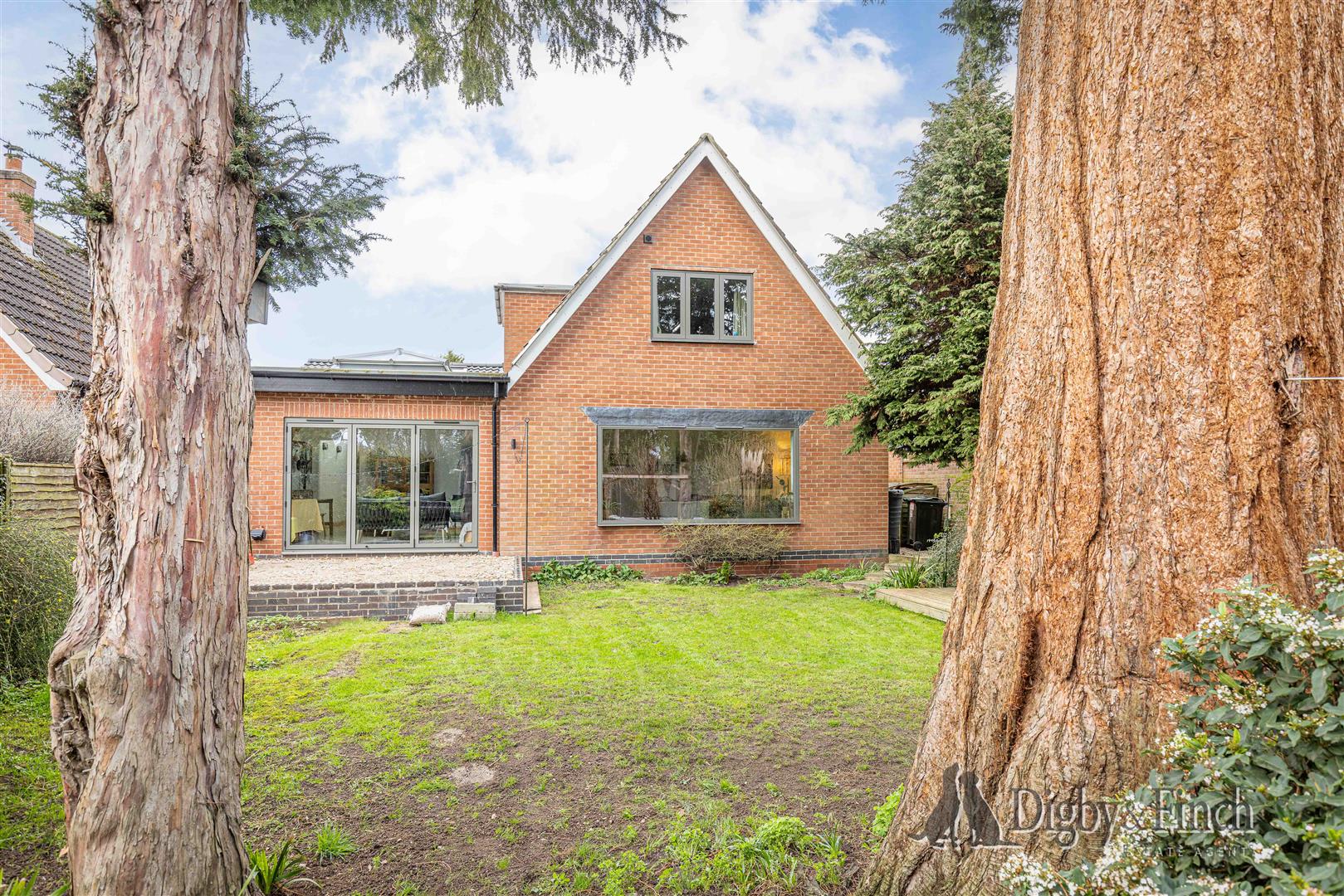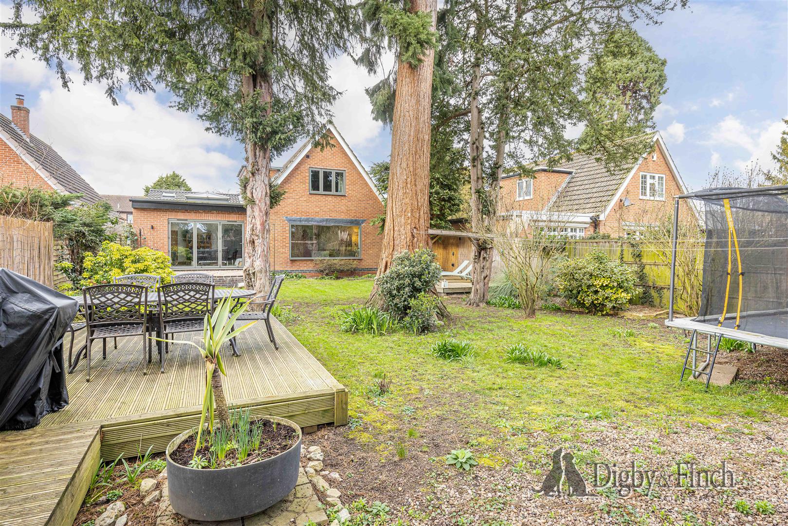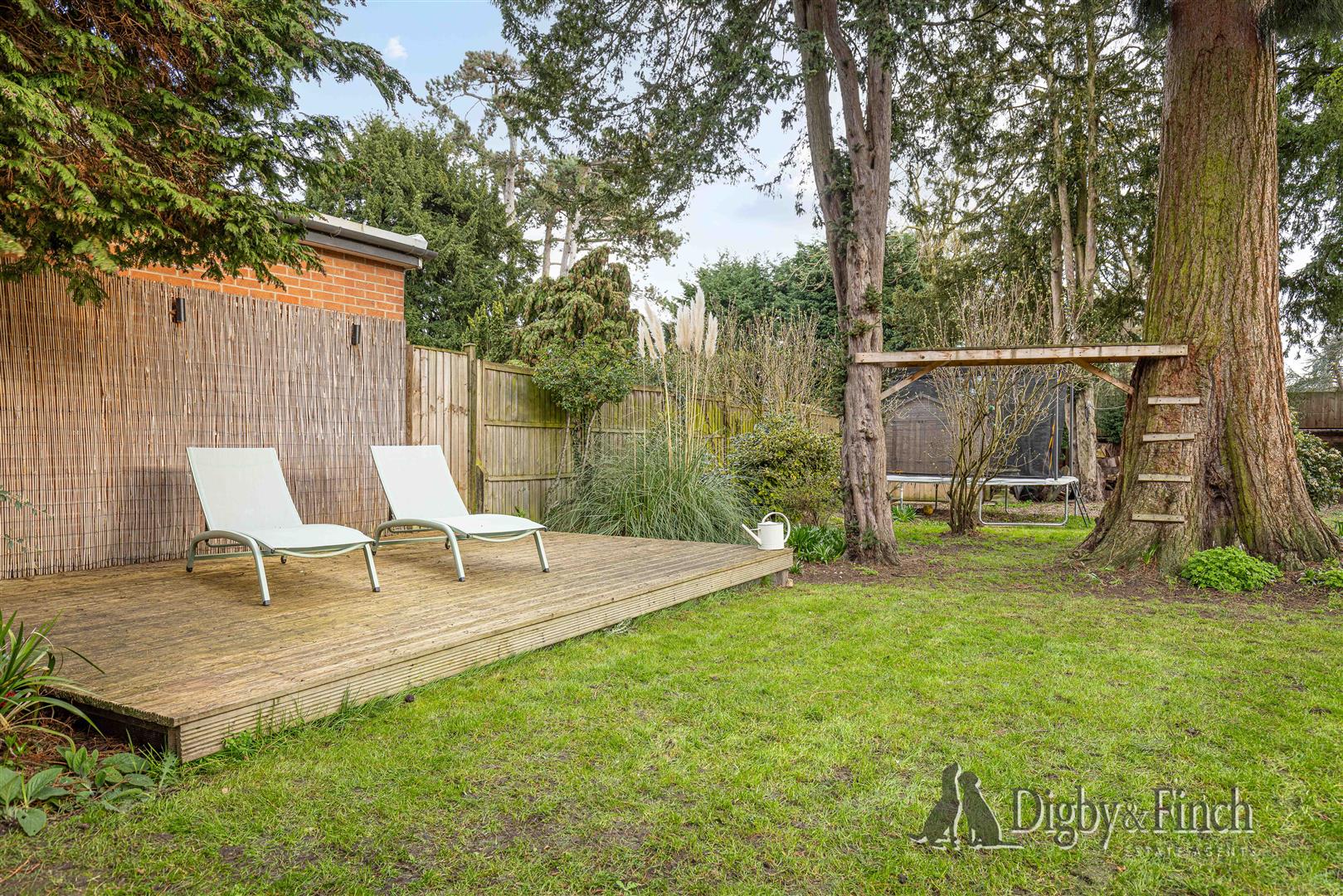 The rear garden is a particularly attractive feature of the property, offering a generous outdoor space well suited to both relaxation and entertaining. The garden is predominantly laid to lawn and is dotted with attractive yew trees, a charming nod to the street’s name, Yew Tree Close. A magnificent Redwood tree stands proudly at the centre of the garden, creating a striking focal point.