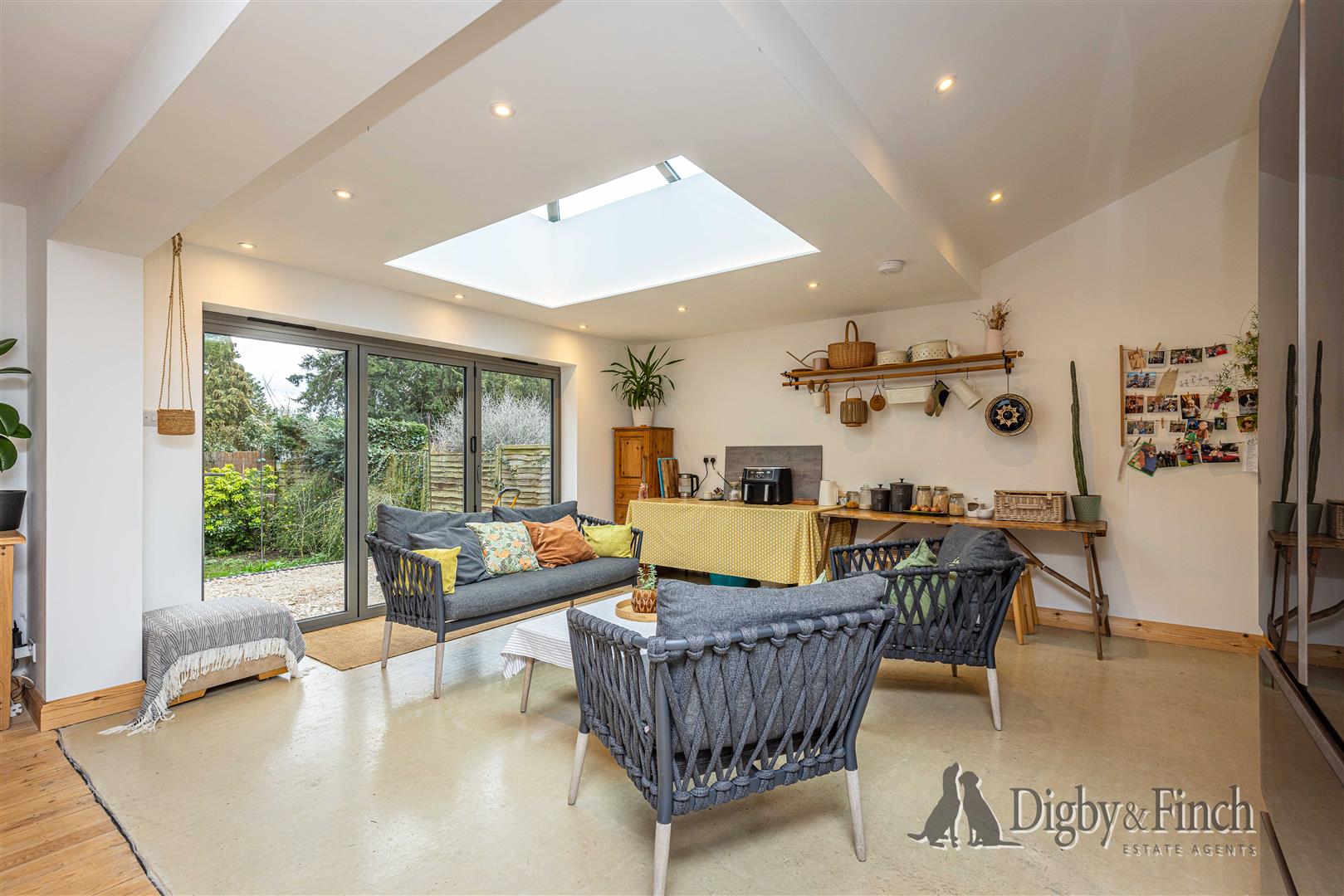 - Superb open-plan living space with lantern skylight and bifold doors to the garden.