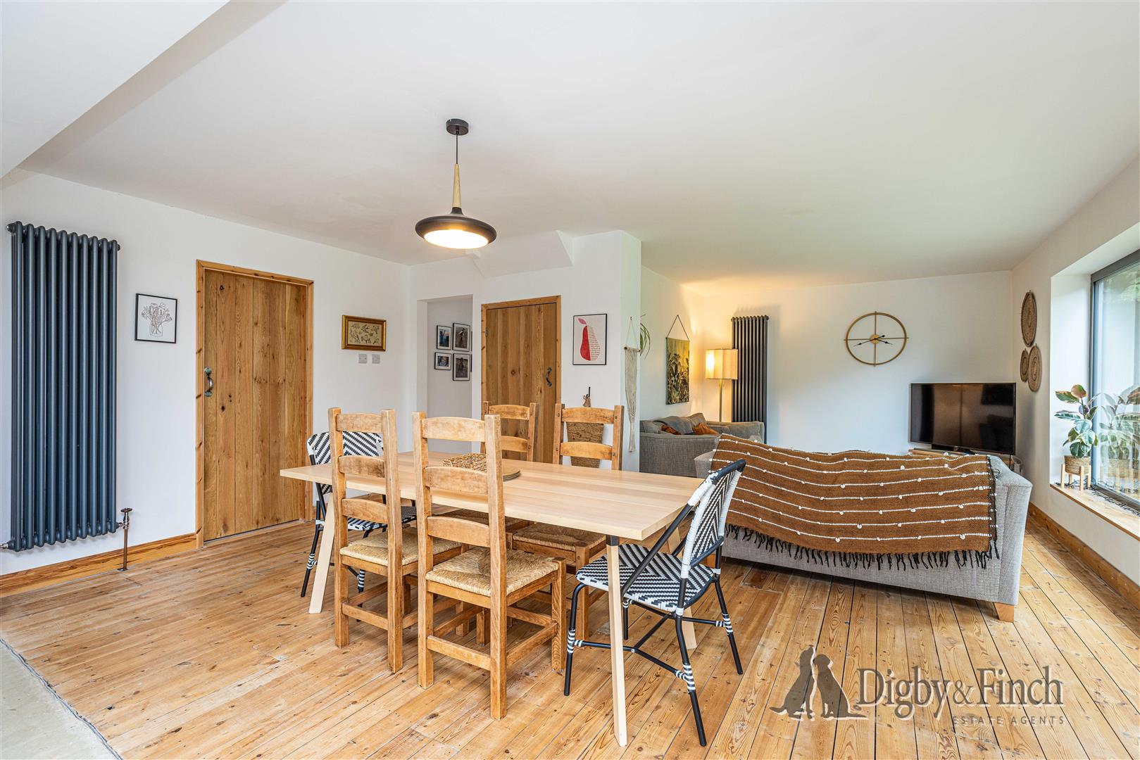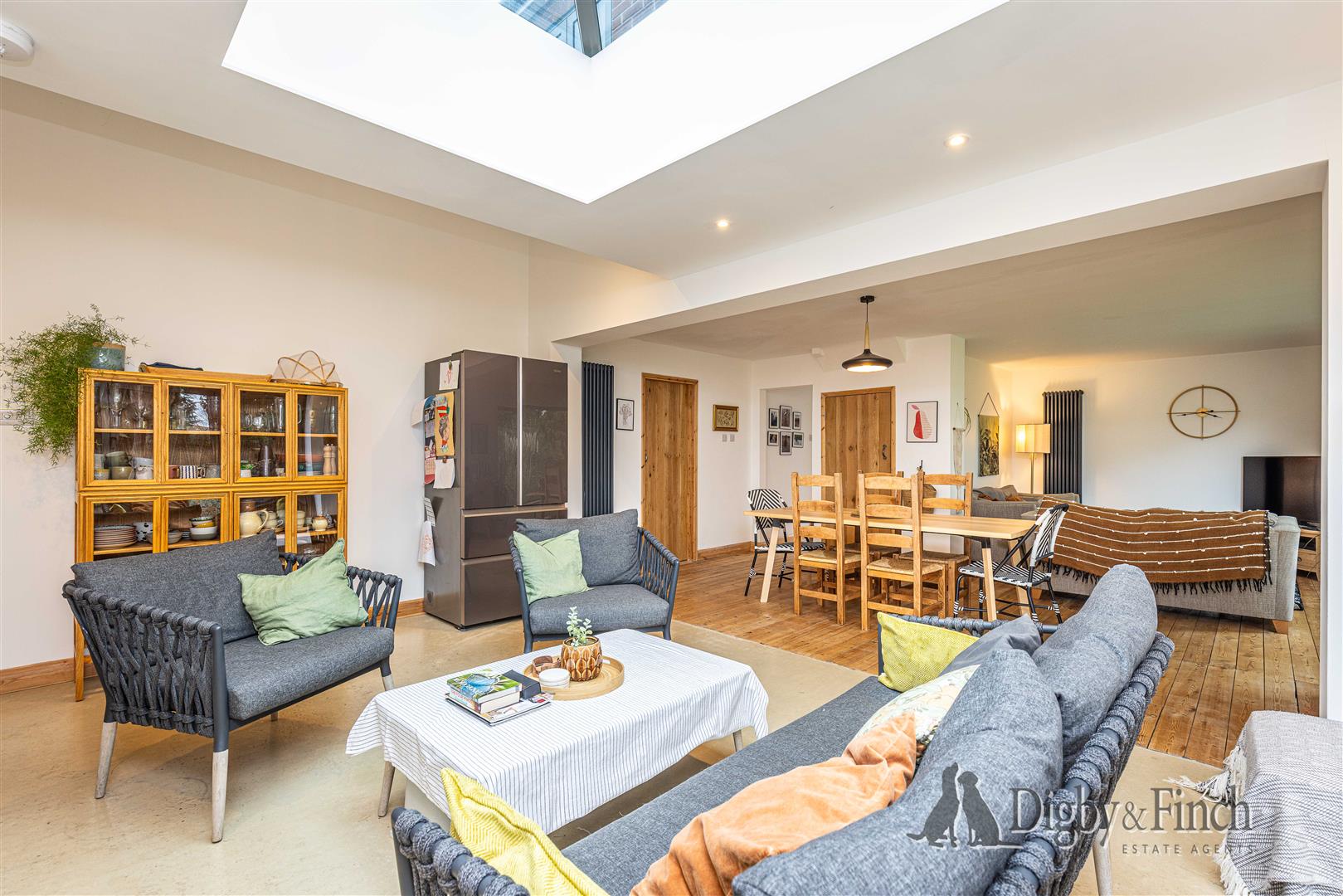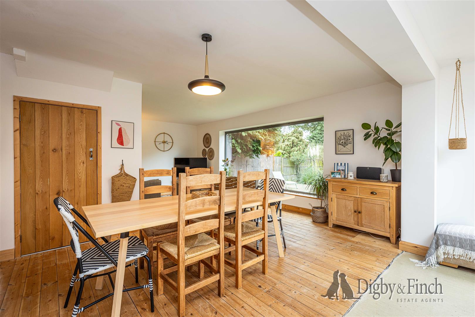Centrally within the open plan space there is ample room for a substantial dining table, making it perfect for family meals and entertaining guests. To the right-hand side is a comfortable sitting area, enhanced by a large picture window that frames views across the garden. A useful understairs cupboard within the dining area provides additional storage.