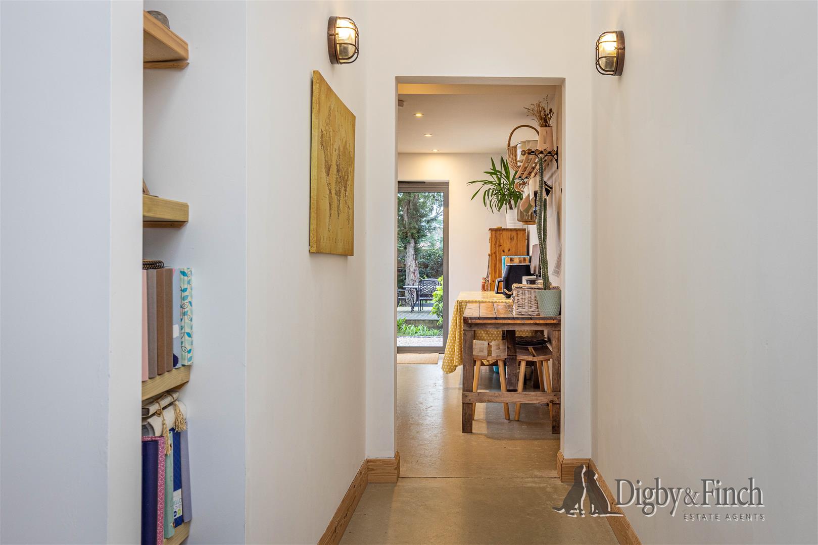 The entrance hall continues into a narrower internal hallway leading toward the principal living accommodation at the rear of the property. This area has been cleverly designed with a built-in desk providing a convenient workspace for home working, along with open shelving ideal for books or decorative display.