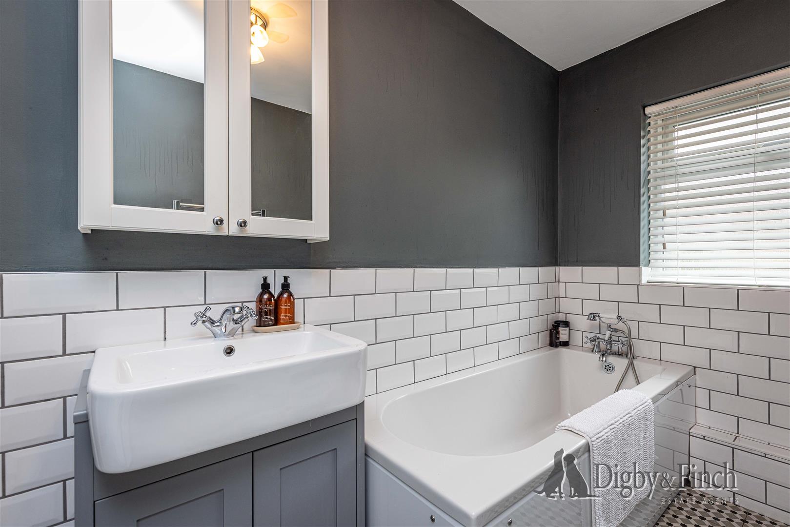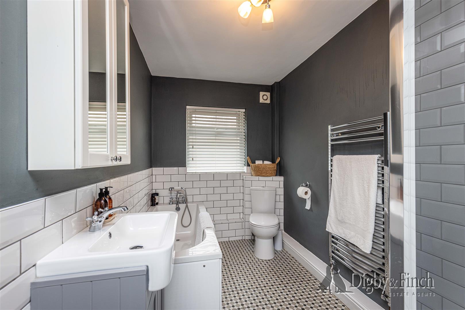 The ground-floor bathroom is impressively spacious and beautifully finished with feature tiled flooring and classic white subway tiling around the bath and shower. The suite comprises a freestanding bath with traditional shower mixer tap, a large separate shower enclosure with rainfall and handheld shower heads, a wash hand basin with vanity storage below, a mirrored cabinet above, a WC, and a heated towel radiator.
