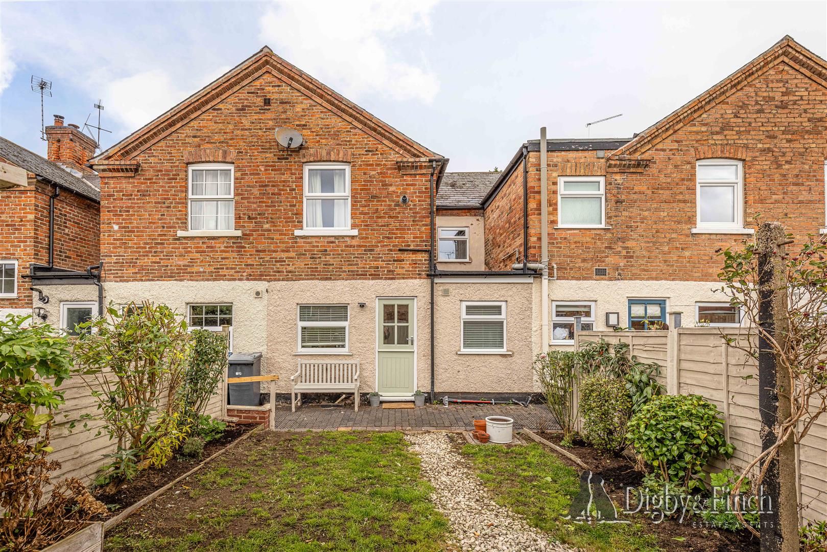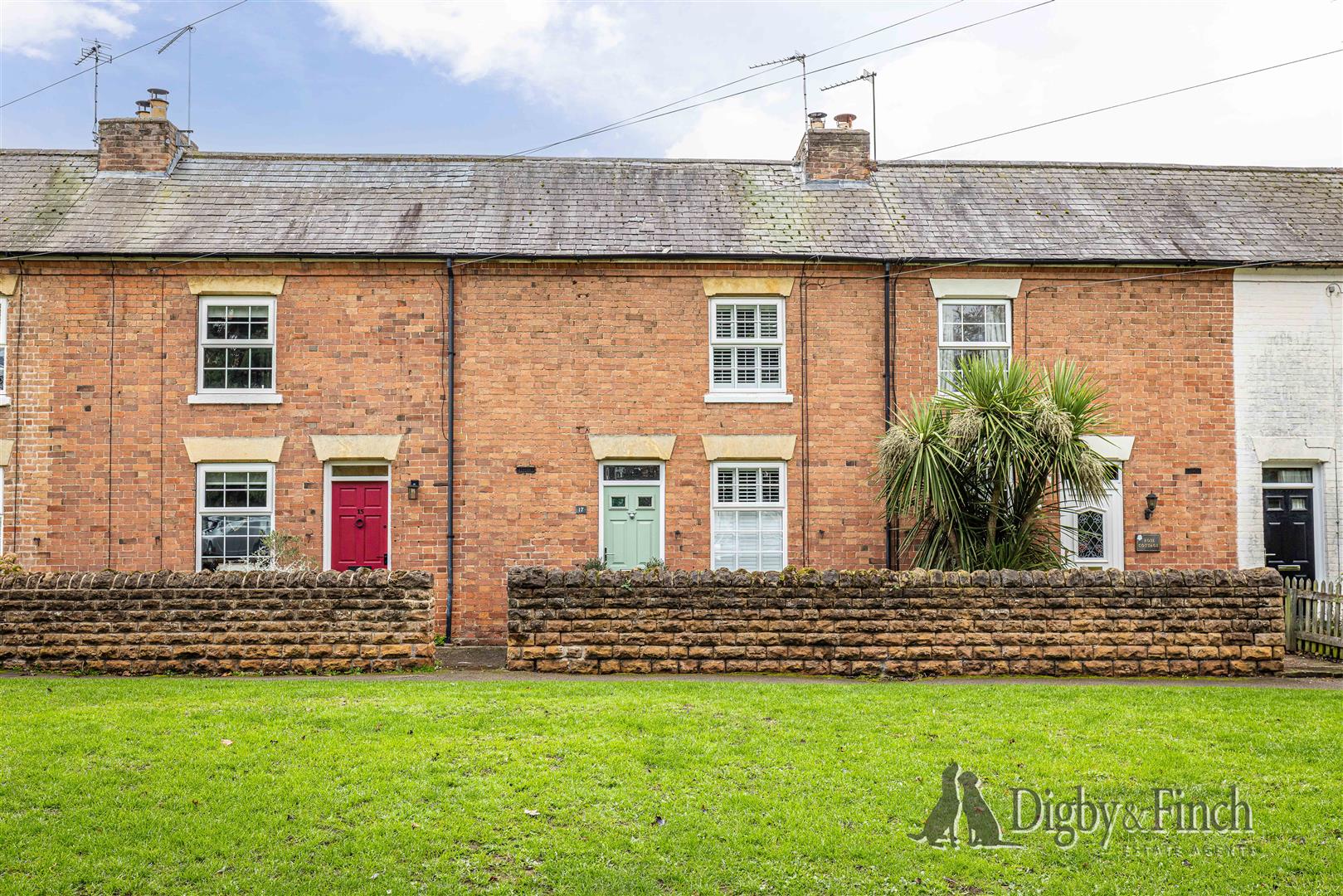The property is approached via a pedestrian pathway across the village green, with a low wall and gravel frontage providing a charming cottage-style entrance.