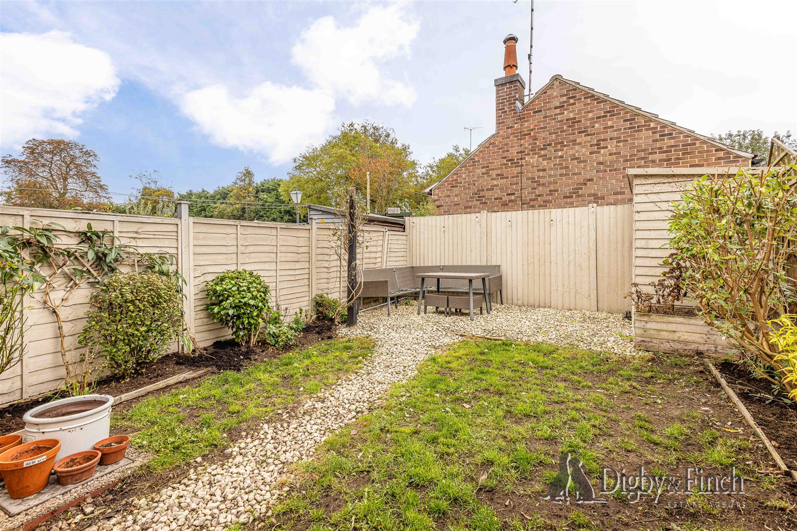 To the rear, the garden is beautifully arranged and mainly laid to lawn, with planted beds running along both sides adding colour and texture. A gravelled pathway meanders through the lawn to a gravelled seating area at the far end – the perfect spot for outdoor dining or enjoying the afternoon sun. A timber shed provides useful storage, and fencing encloses the garden. There is also shared access along the rear of the terrace, allowing for convenient passage when taking out bins or bringing in garden items.