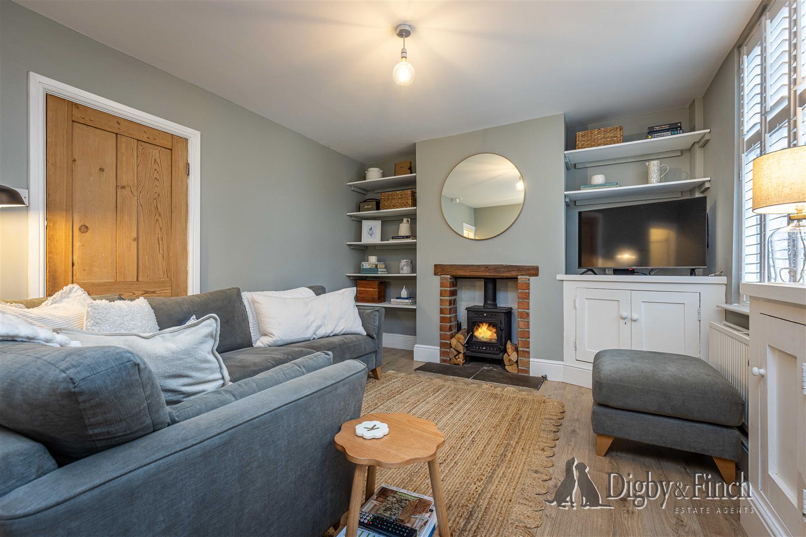 The front door opens into a fabulous open-plan living and dining room, which spans the full width of the property. To the right-hand side, a charming log burner sits on a slate hearth within the chimney breast, framed by a solid wood mantelpiece. Beside the fireplace, fitted shelving and cabinetry provide both style and practicality, with the cupboard neatly housing the gas and electric meters and offering space for a television. The opposite side of the room provides ample space for a dining table, creating a warm and inviting setting for family meals and entertaining.
