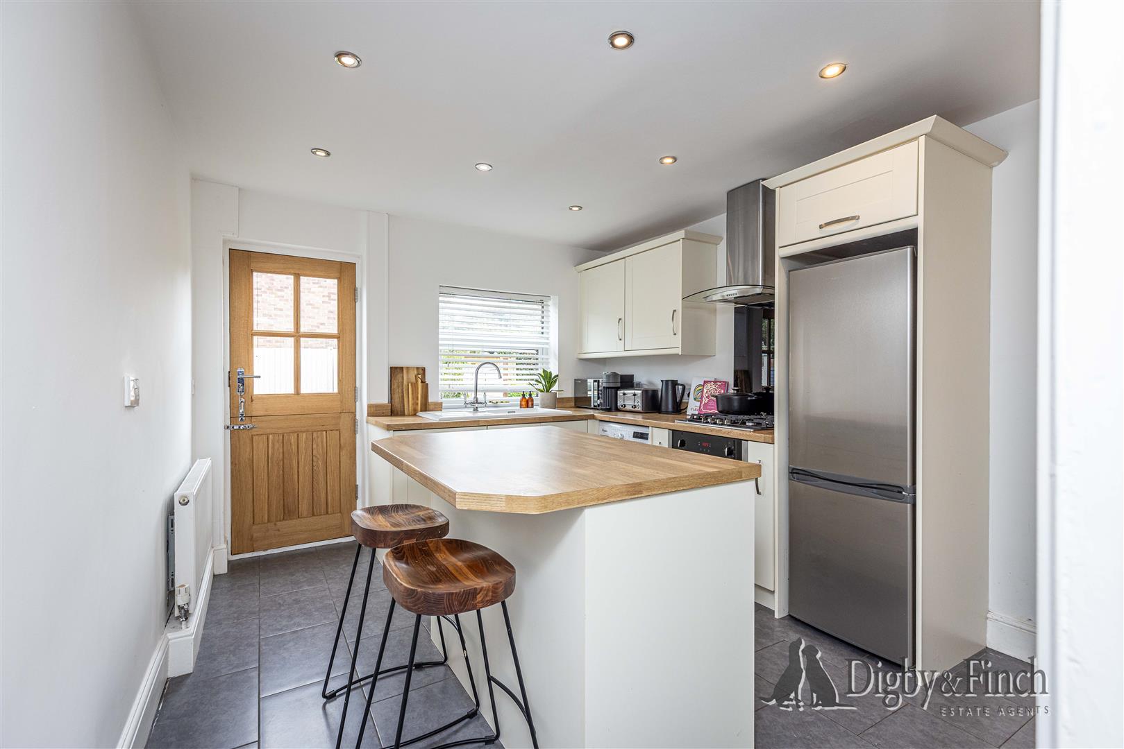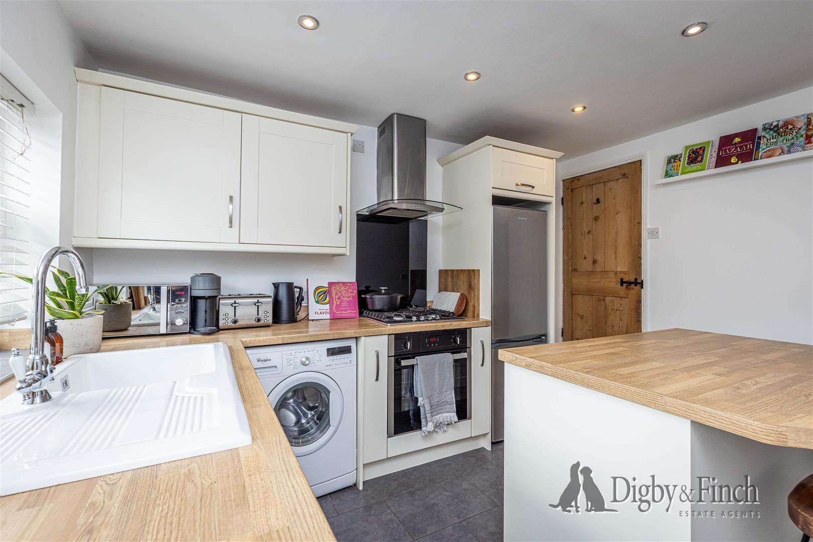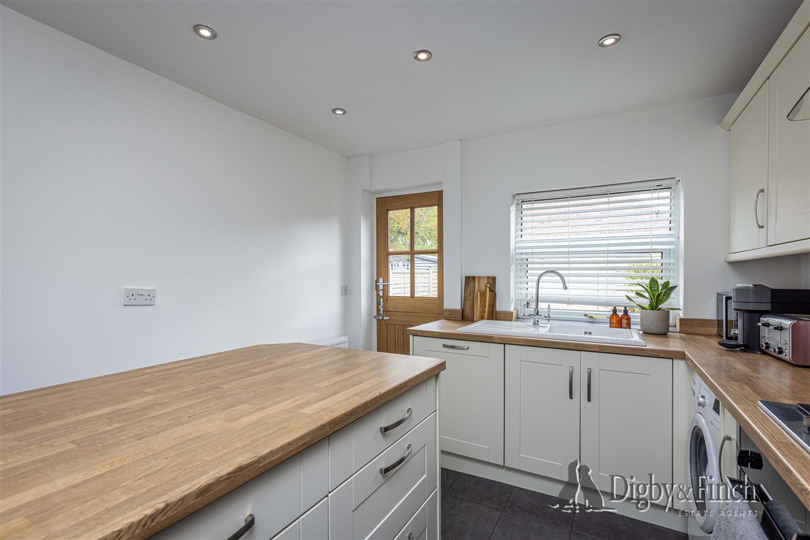 The recently fitted kitchen has been thoughtfully designed to combine functionality with contemporary style. It features cream shaker-style cabinetry set beneath wood-effect worktops, with a single oven and four-ring gas hob with extractor fan above. There is space for an undercounter washing machine and a tall fridge-freezer. A ceramic sink with draining board and mixer tap is positioned next to an integrated dishwasher, beneath the rear-facing window, overlooking the garden. The tiled floor adds a practical touch, while a striking movable central island provides extra storage and preparation space, along with room for two breakfast bar stools, making this a sociable and stylish heart of the home. From here, an internal door leads to the staircase, and a stable-style rear door opens directly onto the garden.