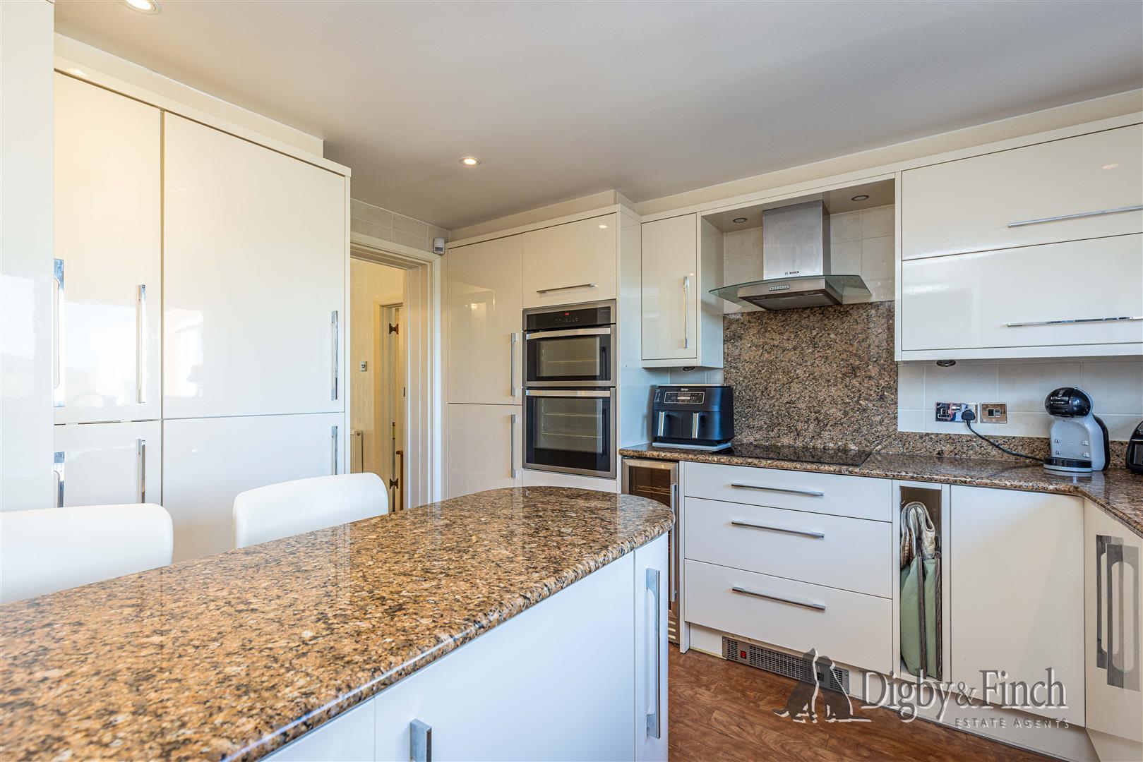 Positioned at the rear of the property, the kitchen is fitted with an extensive range of gloss cream base and wall units, complemented by solid stone worktops, matching splashbacks and tiled walls. A breakfast bar offers seating for two and provides additional preparation space. Integrated appliances include a fridge freezer, slimline wine fridge, double oven and dishwasher. Set beneath the window, the one and a half bowl stainless steel sink with drainer enjoys a pleasant outlook, making everyday tasks more enjoyable.