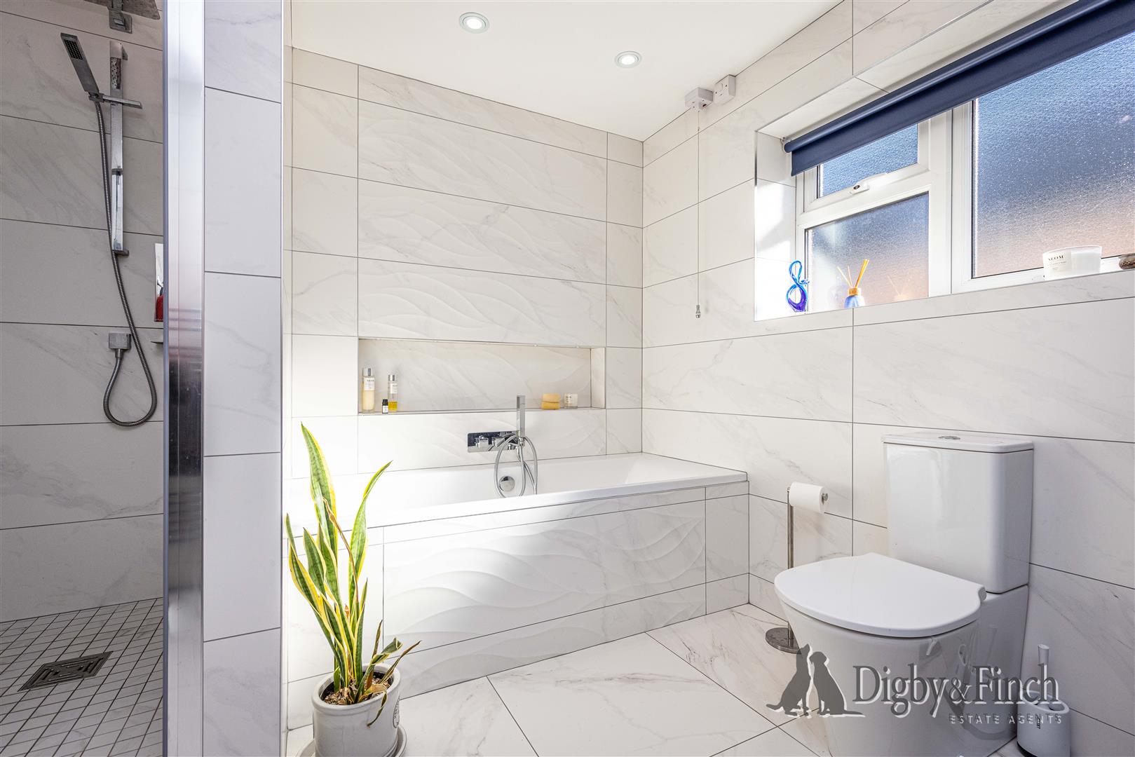 The ground floor bathroom was modernised in 2020 and is finished to a high standard, featuring marble-effect tiling to both walls and floor. A spacious walk-in shower with contrasting tiling includes both rainfall and handheld shower fittings, while a separate bathtub with inset shelving provides additional practicality. A large vanity unit with integrated sink sits beneath a mirrored, illuminated cabinet, complemented by a heated towel rail and WC.