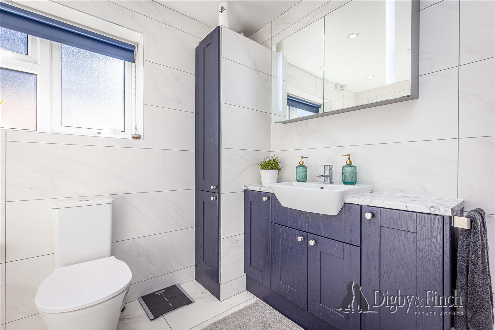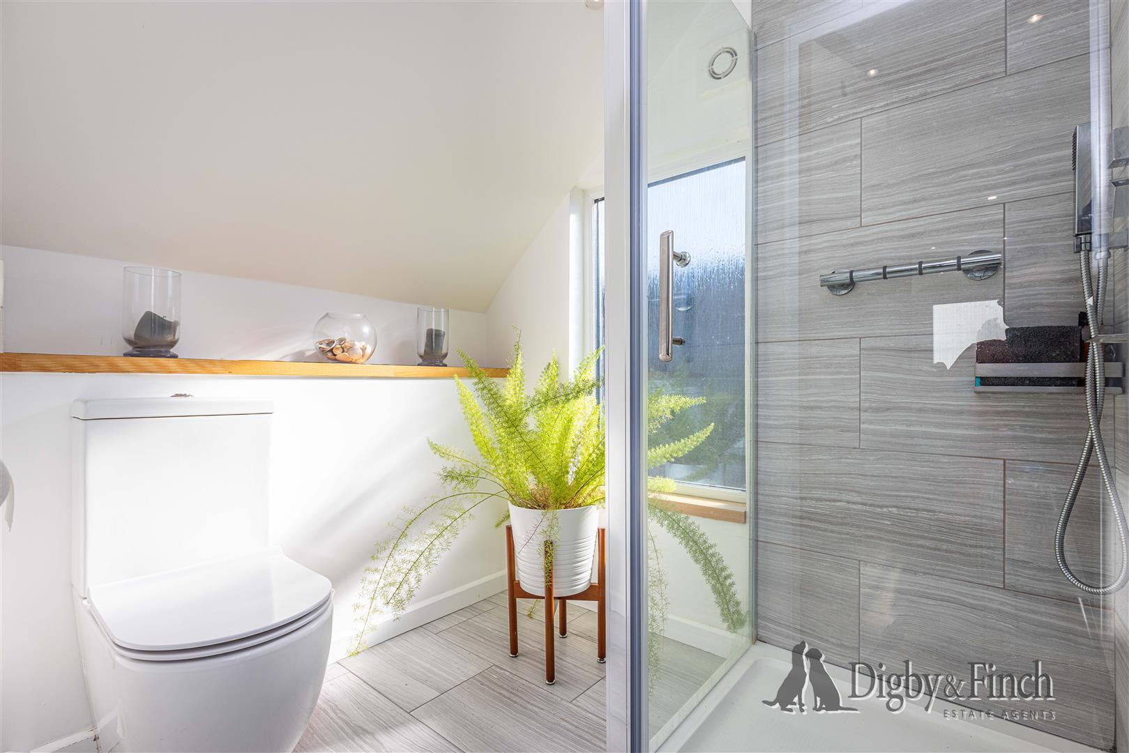 The ensuite shower room is stylishly finished with full tilting window and includes a walk-in shower with both rainfall and handheld shower fittings. A wash hand basin is set within a vanity unit, alongside a WC, creating a well-appointed and private suite.
