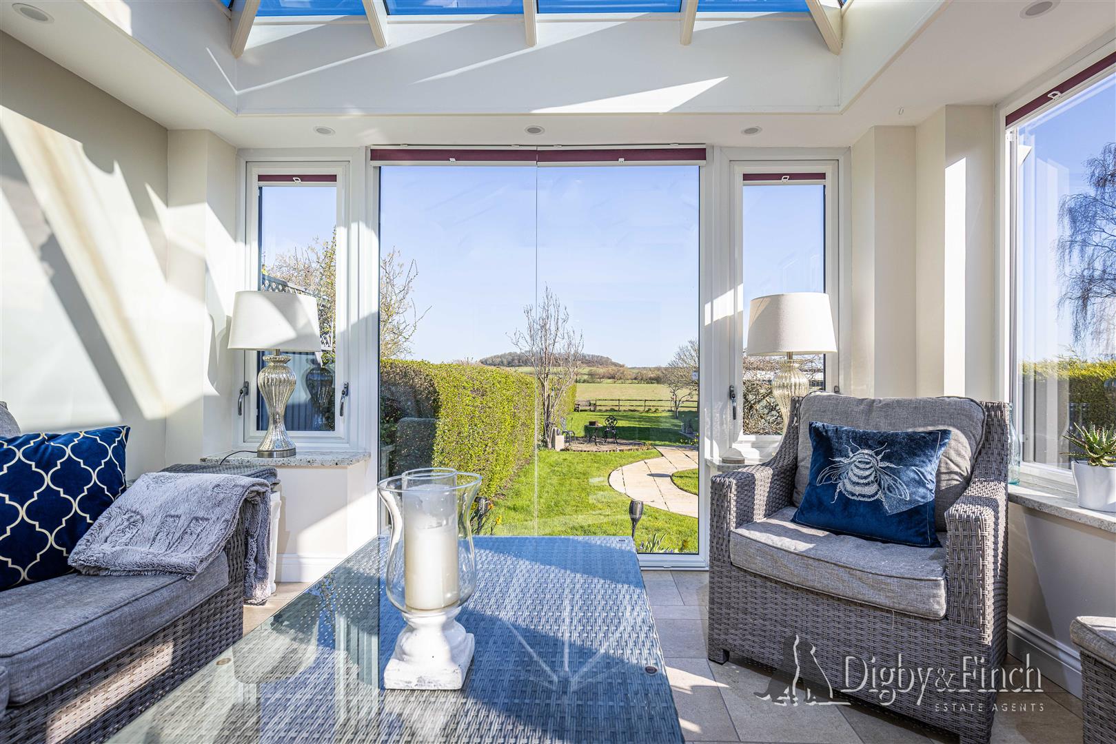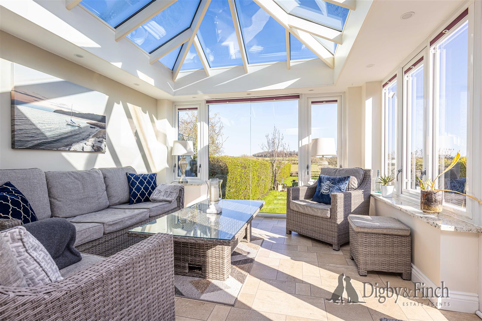 The garden room is a standout feature of the home, forming a light-filled extension of the living space. This beautifully appointed room benefits from underfloor heating, a striking lantern skylight and a large uninterrupted picture window that captures the stunning garden and field views. Patio doors open directly onto the terrace, creating an ideal setting for indoor and outdoor entertaining.