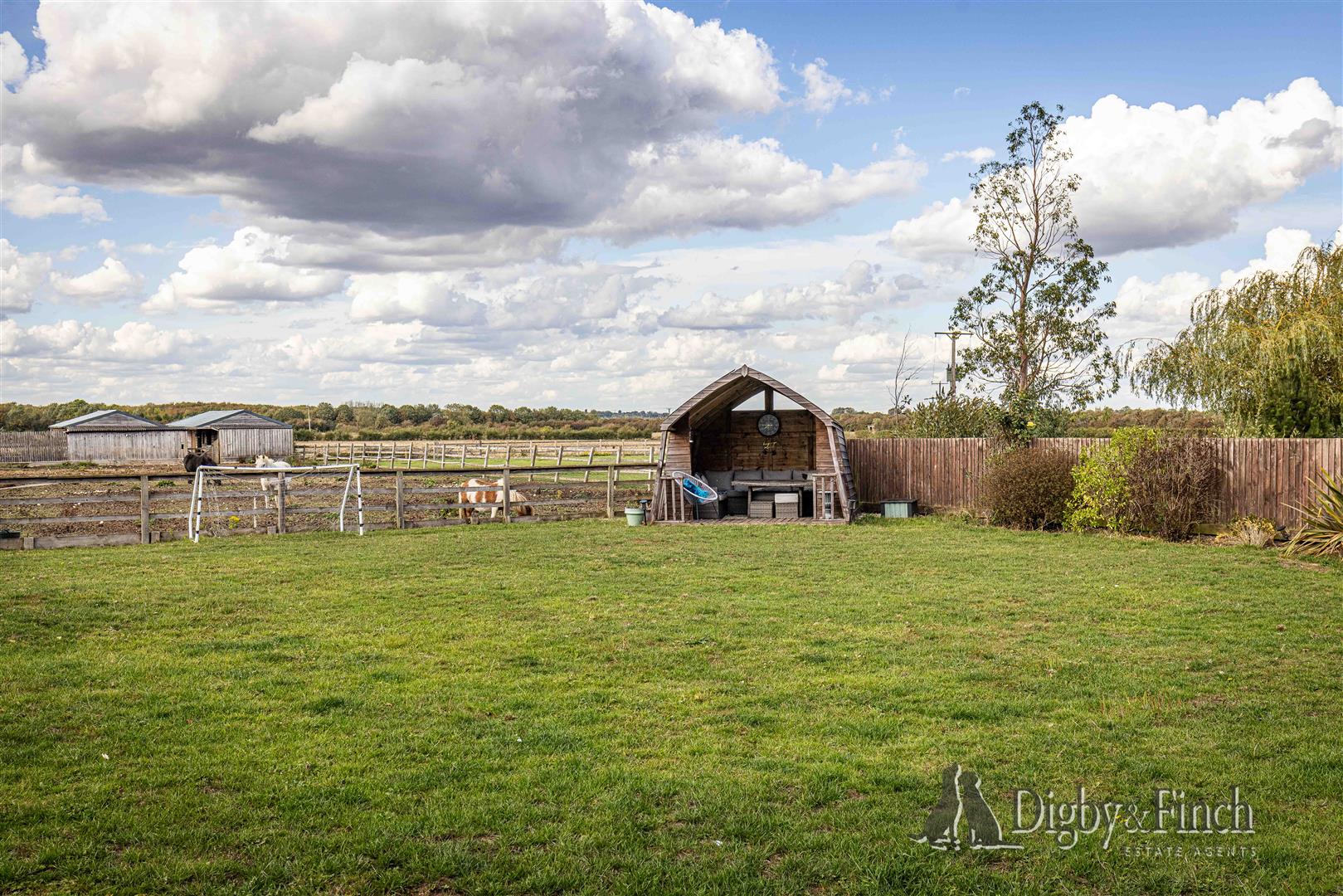 At the far end of the paddock, a separate access road leads to a substantial block of four timber-framed stables, comprising two 12ft x 10ft and two 12ft x 12ft boxes, along with a tack room and further covered stores.